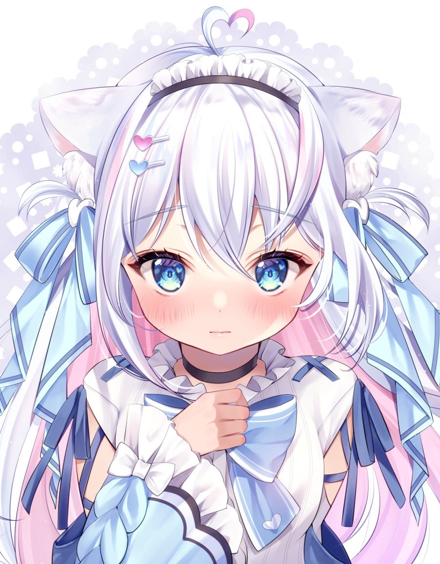 1girl ahoge animal_ears black_choker blue_bow blue_bowtie blue_eyes blue_ribbon blush bow bowtie cat_ears choker colored_inner_hair commentary_request detached_sleeves hair_between_eyes hair_ribbon hand_on_own_chest heart heart_ahoge indie_virtual_youtuber kazari_lua long_hair long_sleeves looking_at_viewer maid_headdress multicolored_hair pink_hair ribbon shirt single_sidelock sleeveless sleeveless_shirt solo straight-on upper_body virtual_youtuber white_background white_hair white_shirt wide_sleeves yugaa