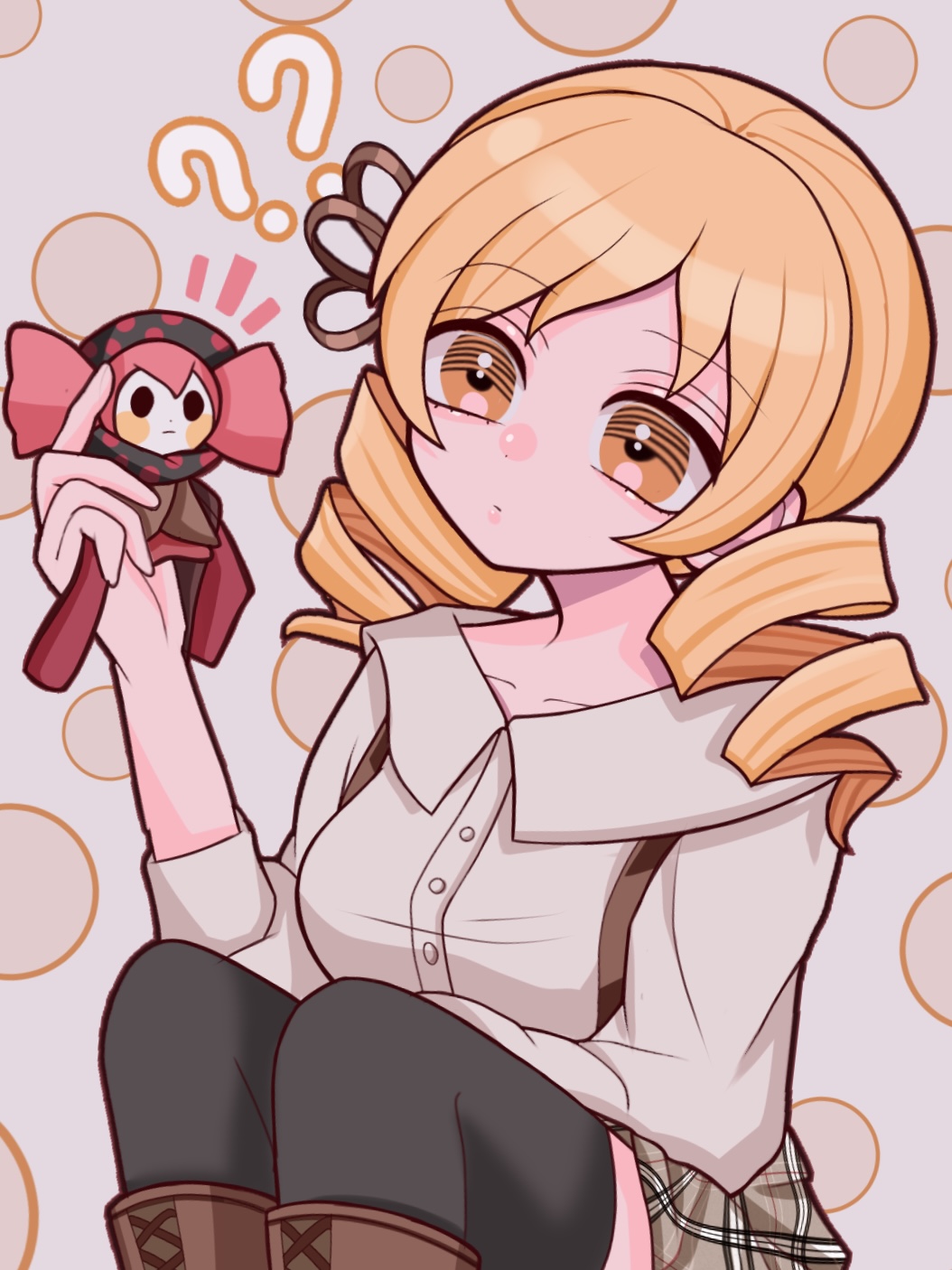 1girl ? ?? black_thighhighs blonde_hair boots breasts brown_boots character_doll character_request collarbone doll drill_hair highres holding holding_stuffed_toy keropiki knee_boots mahou_shoujo_madoka_magica mahou_shoujo_madoka_magica_(anime) medium_breasts medium_hair solo stuffed_toy thighhighs tomoe_mami twin_drills
