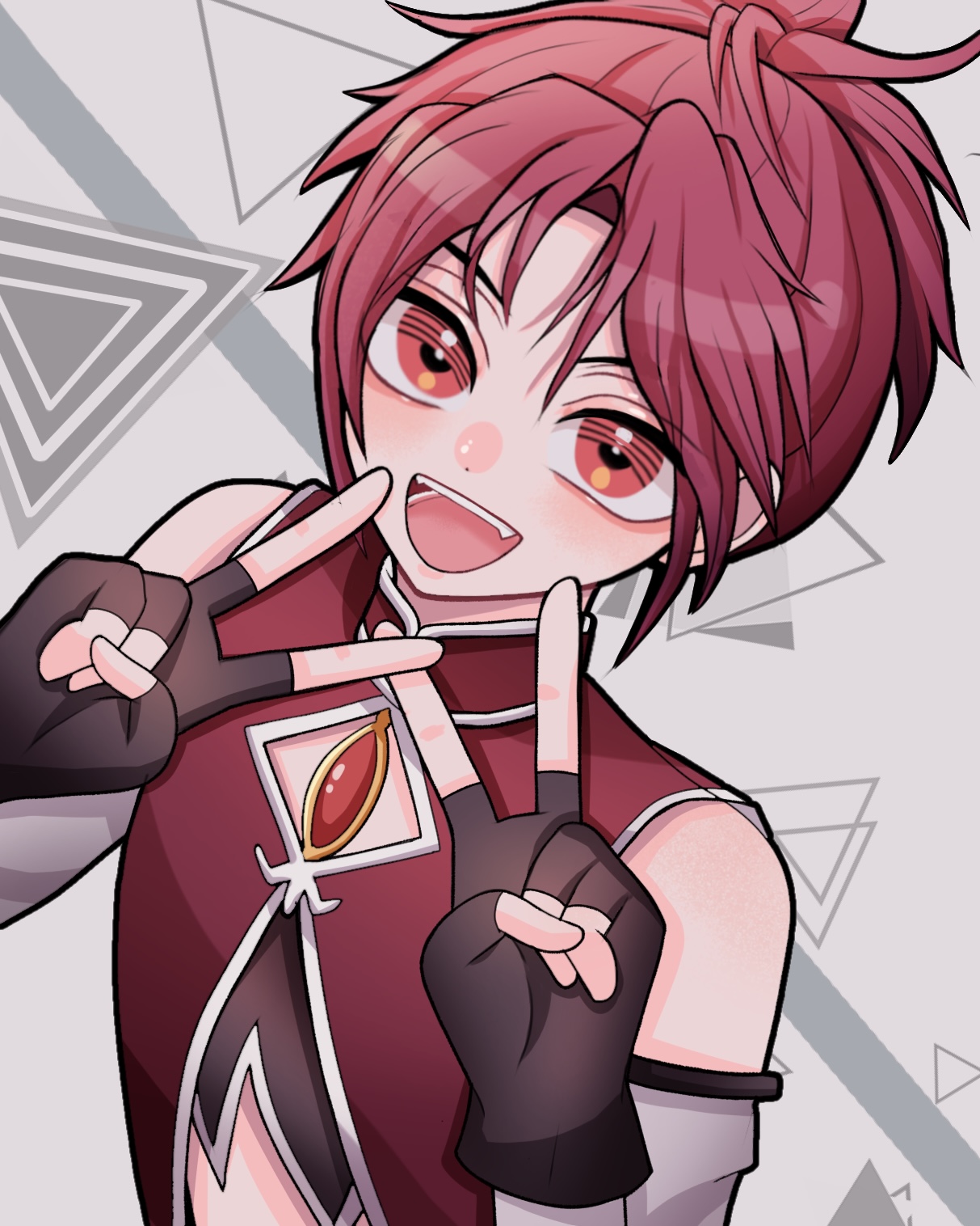 1boy black_gloves blush double_v fangs fingerless_gloves genderswap genderswap_(ftm) gloves highres keropiki looking_at_viewer mahou_shoujo_madoka_magica mahou_shoujo_madoka_magica_(anime) open_mouth red_eyes red_hair sakura_kyoko short_hair smile solo teeth tongue upper_body upper_teeth_only v