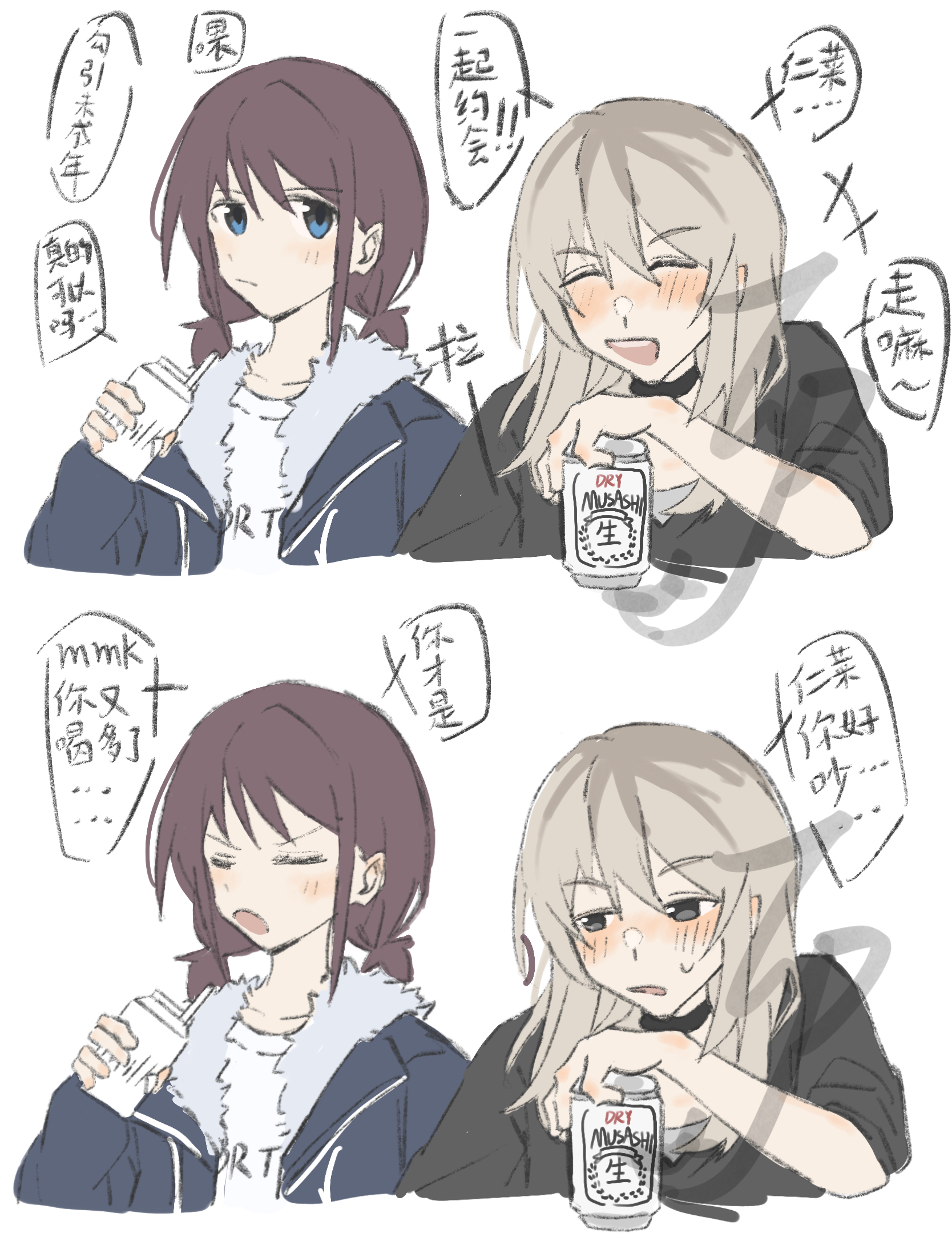 2girls beer_can black_sweater blue_eyes blue_jacket blush brown_hair can chinese_text closed_eyes drink_can drink_carton drunk fish_(sakana135026) girls_band_cry grey_eyes grey_hair hair_between_eyes highres iseri_nina jacket kawaragi_momoka long_hair low_twintails milk_carton multicolored_hair multiple_girls open_clothes open_jacket open_mouth roots_(hair) shirt short_hair short_twintails sidelocks sleeves_rolled_up sweatdrop sweater translation_request twintails white_background white_shirt