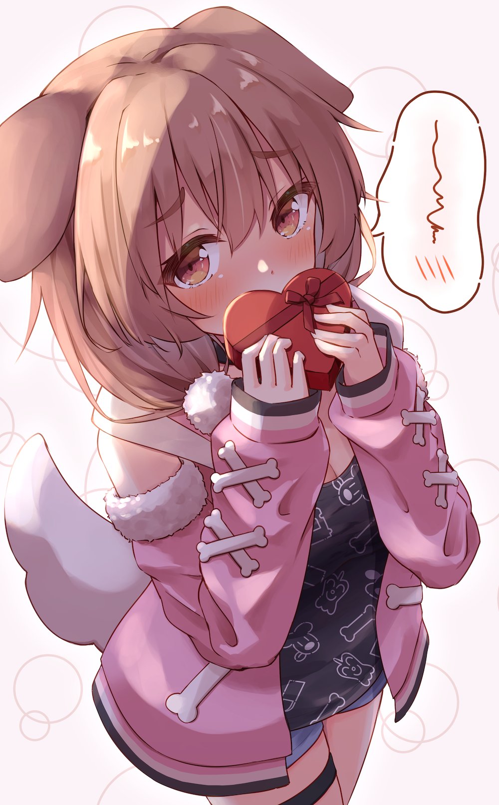 1girl animal_ears backlighting black_skirt blush bone_print box brown_eyes brown_hair character_print cowboy_shot dog_ears dog_girl dog_tail fur-trimmed_jacket fur_trim hashtag-only_commentary heart-shaped_box highres hololive hoso-inu inugami_korone inugami_korone_(roomwear) jacket long_hair long_sleeves looking_at_viewer minazuki_mizu official_alternate_costume pink_jacket short_shorts shorts skirt sleeves_past_wrists solo speech_bubble tail thigh_strap virtual_youtuber white_background