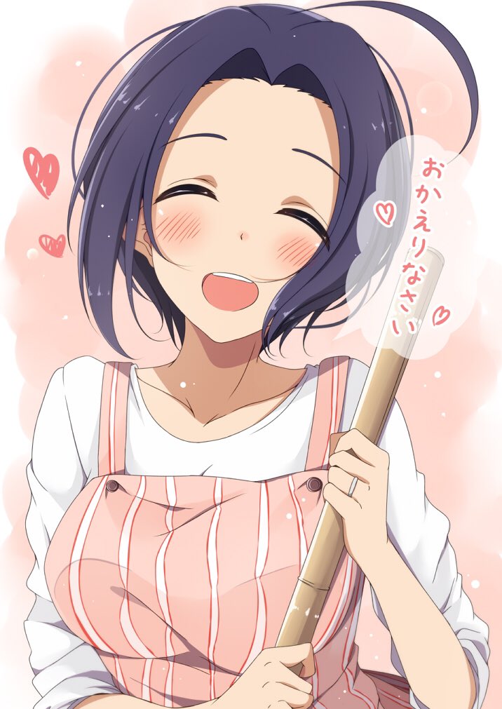 1girl ^_^ ahoge apron blue_hair blush breasts broom closed_eyes collarbone dot_nose heart hitotsuki_nanoka holding holding_broom idolmaster idolmaster_(classic) idolmaster_million_live! idolmaster_million_live!_theater_days jewelry large_breasts long_sleeves miura_azusa open_mouth pink_apron pink_background ring shirt short_hair smile solo speech_bubble striped_apron striped_clothes teeth upper_body upper_teeth_only white_shirt