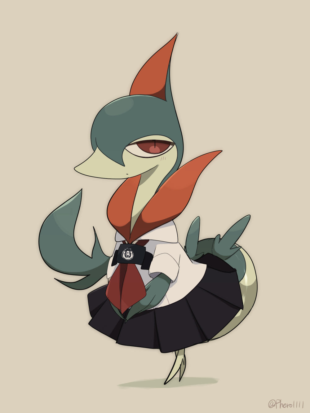 1girl a-nya artist_name black_dress blush brown_background closed_mouth clothed_pokemon collared_shirt colored_skin dot_mouth dress expressionless female_focus flat_chest full_body furry furry_female gen_5_pokemon green_skin half-closed_eyes highres light_blush looking_afar miniskirt multicolored_skin neckerchief nintendo own_hands_together pleated_skirt pokemon pokemon_(creature) red_eyes red_neckerchief red_sailor_collar sailor_collar school_uniform serafuku servine shirt short_sleeves signature simple_background skirt slit_pupils snout solo standing tail twitter_username two-tone_skin white_shirt
