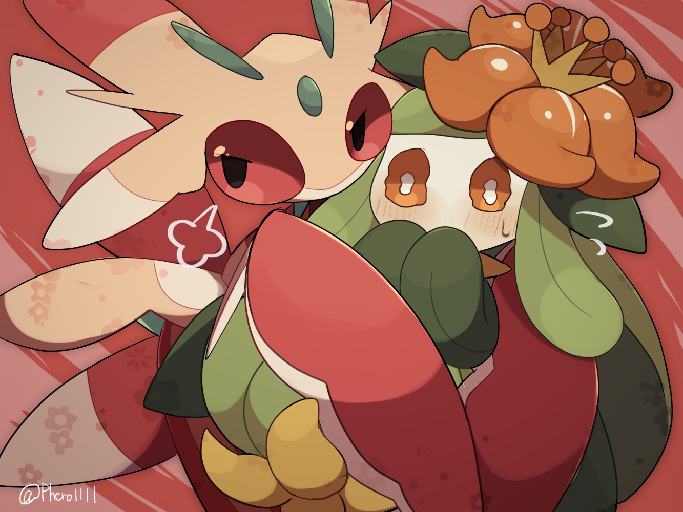 2girls a-nya antennae arthropod_girl artist_name black_eyes breath bright_pupils carrying colored_sclera colored_skin covering_own_mouth crown female_focus floral_print flower flying_sweatdrops gen_5_pokemon gen_7_pokemon green_hair green_skin hair_flower hair_ornament hands_up hug lilligant long_hair looking_to_the_side lurantis mini_crown monster_girl multicolored_skin multiple_girls nintendo no_mouth orange_eyes own_hands_together pink_skin plant_girl pokemon pokemon_(creature) princess_carry protecting puff_of_air red_background red_flower red_sclera sidelocks signature twitter_username two-tone_skin v-shaped_eyebrows wavy_eyes white_pupils white_skin yellow_crown