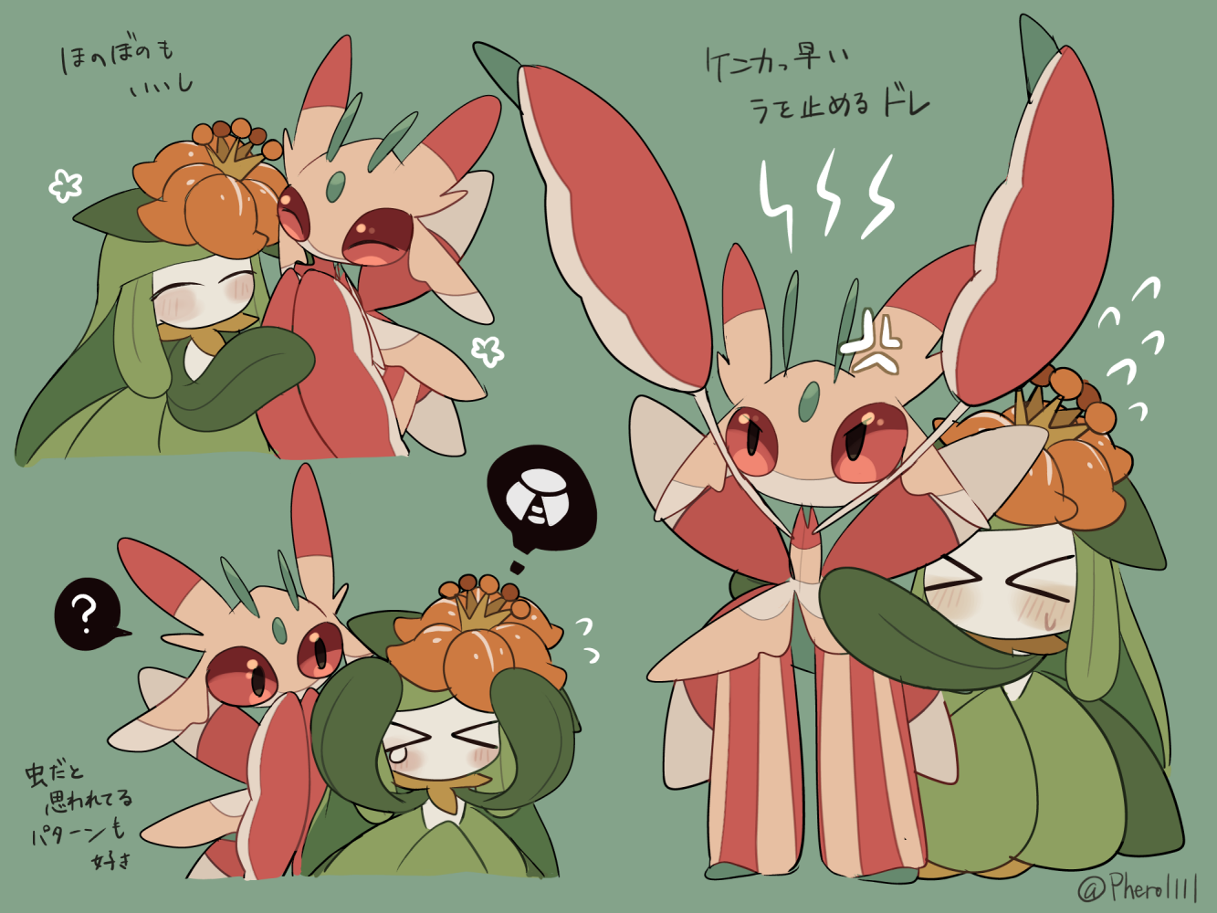 >_< 2girls ? ^_^ a-nya anger_vein antennae arms_up arthropod_girl artist_name black_eyes blush closed_eyes colored_sclera colored_skin cropped_torso crown female_focus flat_chest flower flying_sweatdrops gen_5_pokemon gen_7_pokemon green_background green_hair green_skin hair_flower hair_ornament hands_on_own_head hands_up hiding hiding_behind_another japanese_text lilligant long_hair lurantis mini_crown monster_girl multicolored_skin multiple_girls multiple_views nintendo no_mouth outstretched_arms own_hands_together pink_skin plant_girl pokemon pokemon_(creature) protecting red_flower red_sclera scared sidelocks signature simple_background speech_bubble spoken_question_mark striped_skin sweat tears thought_bubble translation_request twitter_username two-tone_skin upper_body v-shaped_eyebrows waist_grab white_skin yellow_crown
