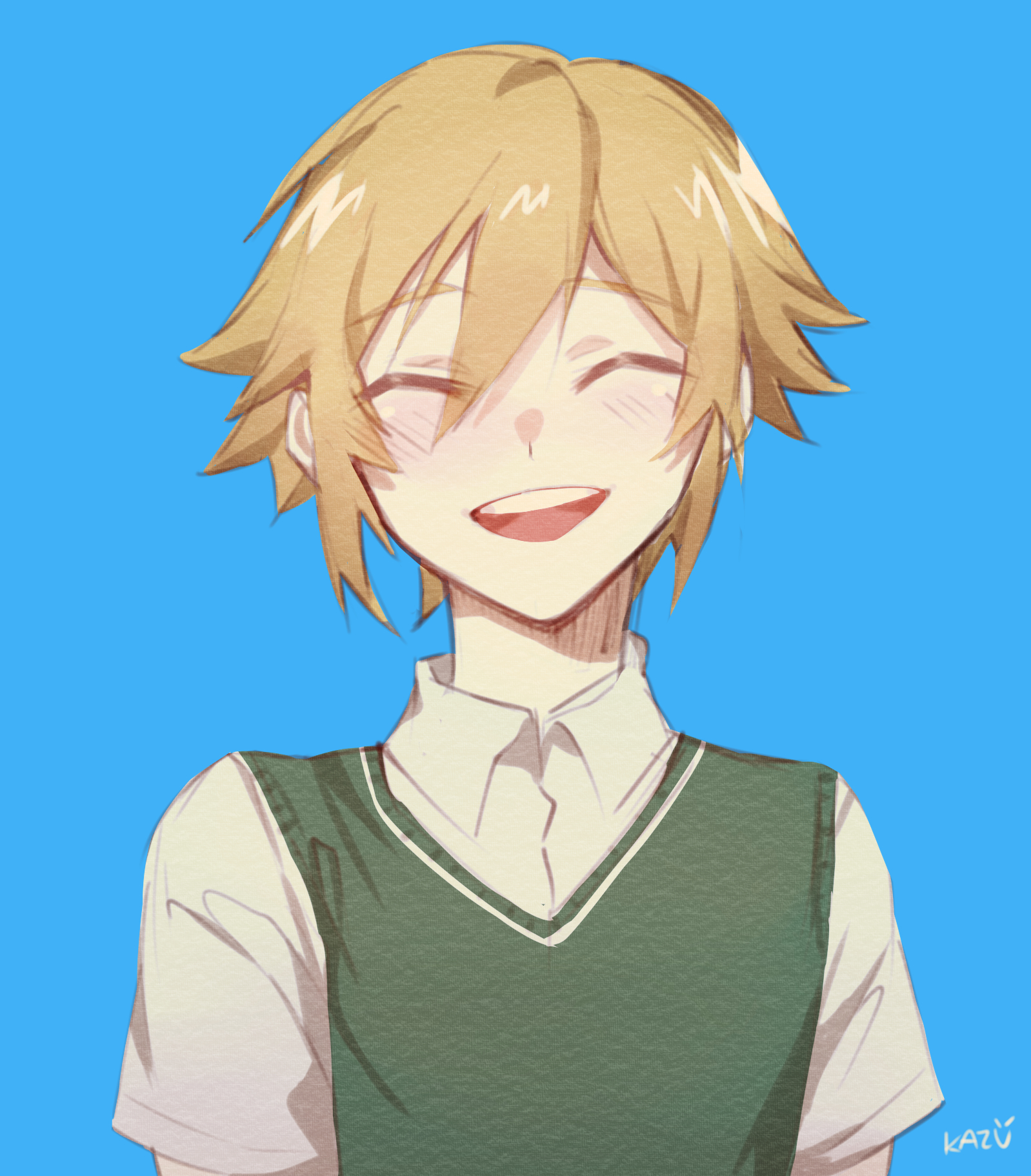 1boy ^_^ arms_at_sides artist_name basil_(faraway)_(omori) basil_(omori) blonde_hair blue_background blush closed_eyes collared_shirt commentary english_commentary facing_viewer green_sweater_vest hair_between_eyes highres kazuya_(kozun) omori open_mouth shirt short_hair short_sleeves sidelocks simple_background solo straight-on sweater_vest teeth tongue upper_body upper_teeth_only white_shirt
