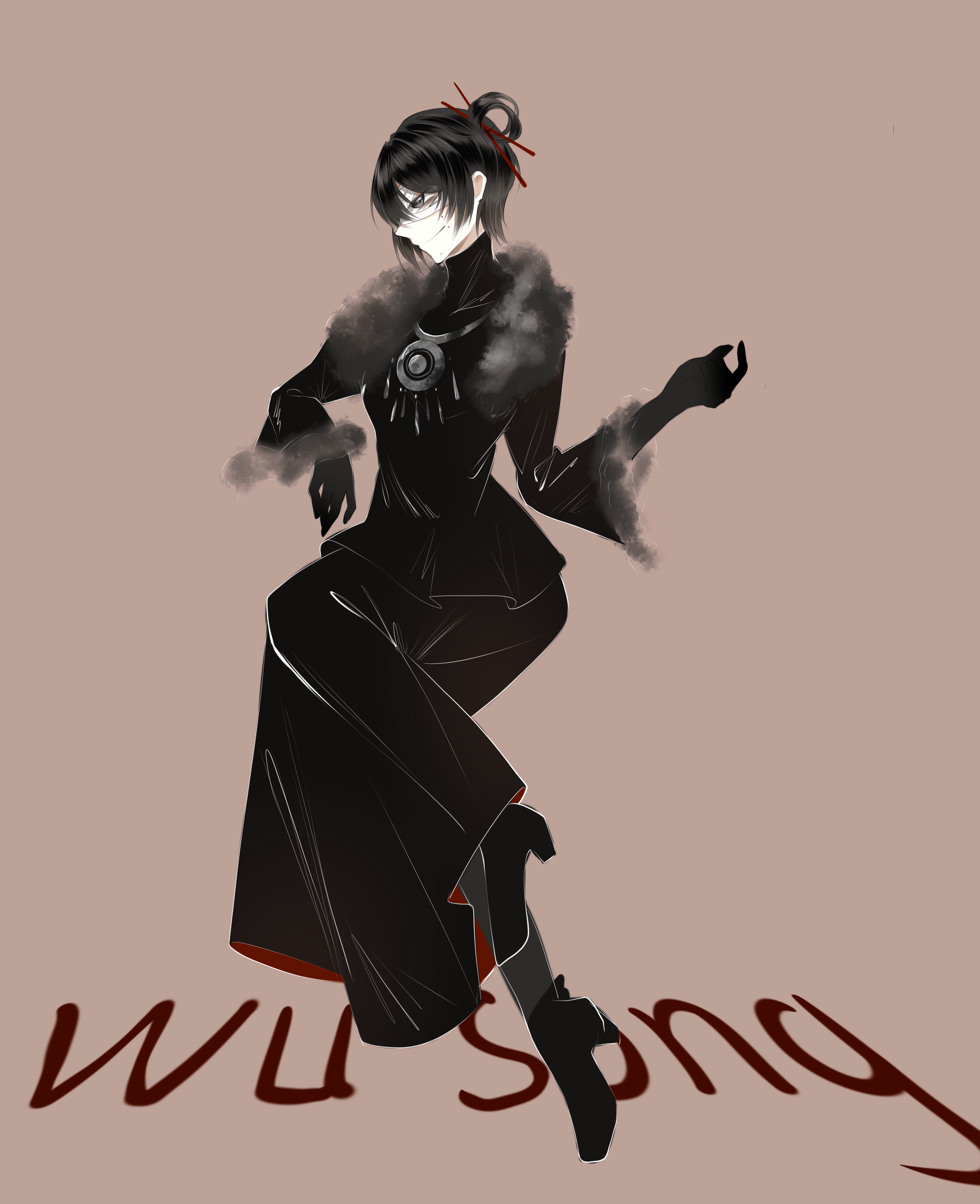 1girl absurdres bandaged_head bandages black_boots black_gloves black_hair black_shirt black_skirt boots brown_hair character_name chinese_commentary closed_mouth commentary_request fur-trimmed_sleeves fur_trim gloves hair_ornament hair_rings hair_stick highres hui_yue invisible_chair long_skirt long_sleeves mole mole_above_mouth mole_under_mouth multiple_moles pale_skin shirt short_hair simple_background single_hair_ring sitting skirt smile solo touqi_guaitan wu_song_(female)_(touqi_guaitan)
