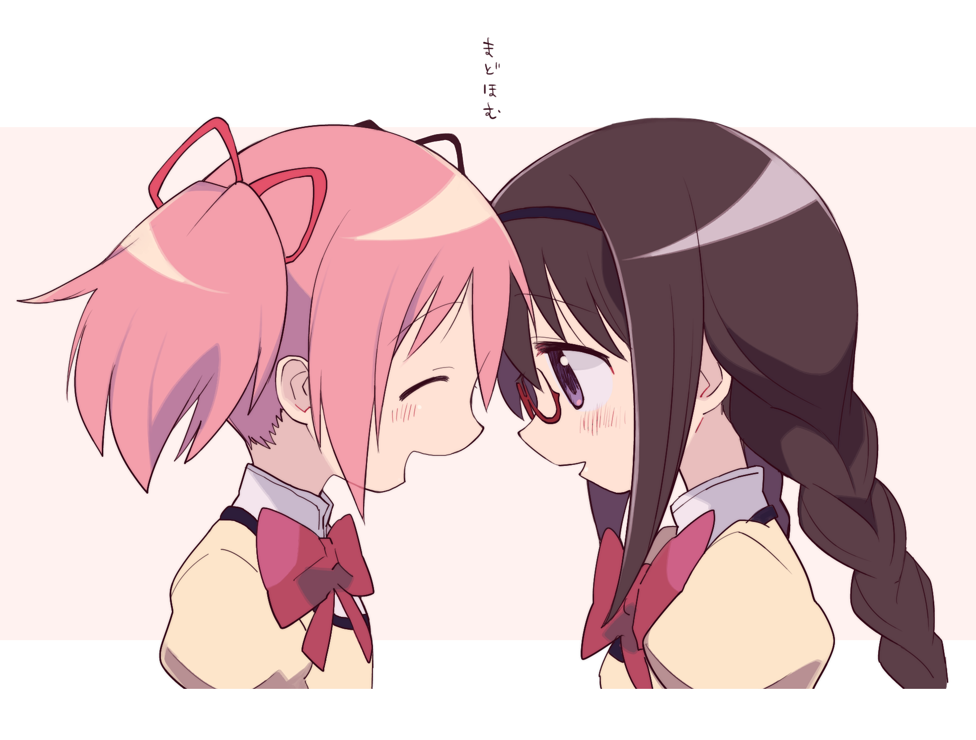 2girls ^_^ akemi_homura black_hair black_hairband blue_eyes bow bowtie braid closed_eyes face-to-face facing_another forehead-to-forehead from_side glasses hair_ribbon hairband heads_together highres ikuchi_osutega kaname_madoka long_hair looking_at_another mahou_shoujo_madoka_magica mahou_shoujo_madoka_magica_(anime) mitakihara_school_uniform multiple_girls open_mouth pink_hair portrait profile puffy_sleeves red-framed_eyewear red_bow red_bowtie ribbon school_uniform semi-rimless_eyewear pairing_name short_hair short_twintails simple_background smile twin_braids twintails under-rim_eyewear white_background