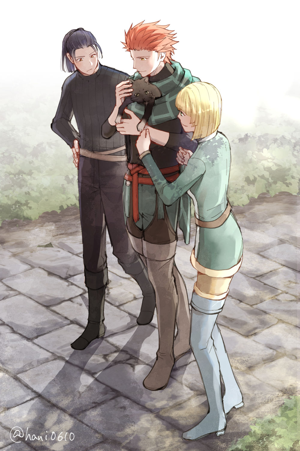 1girl 1other 2boys black_cat black_hair black_sweater blonde_hair brick_road cat felix_hugo_fraldarius fire_emblem fire_emblem:_three_houses fire_emblem_warriors:_three_hopes highres ingrid_brandl_galatea multiple_boys nintendo orange_hair spiked_hair sweater sylvain_jose_gautier thighhighs waniya