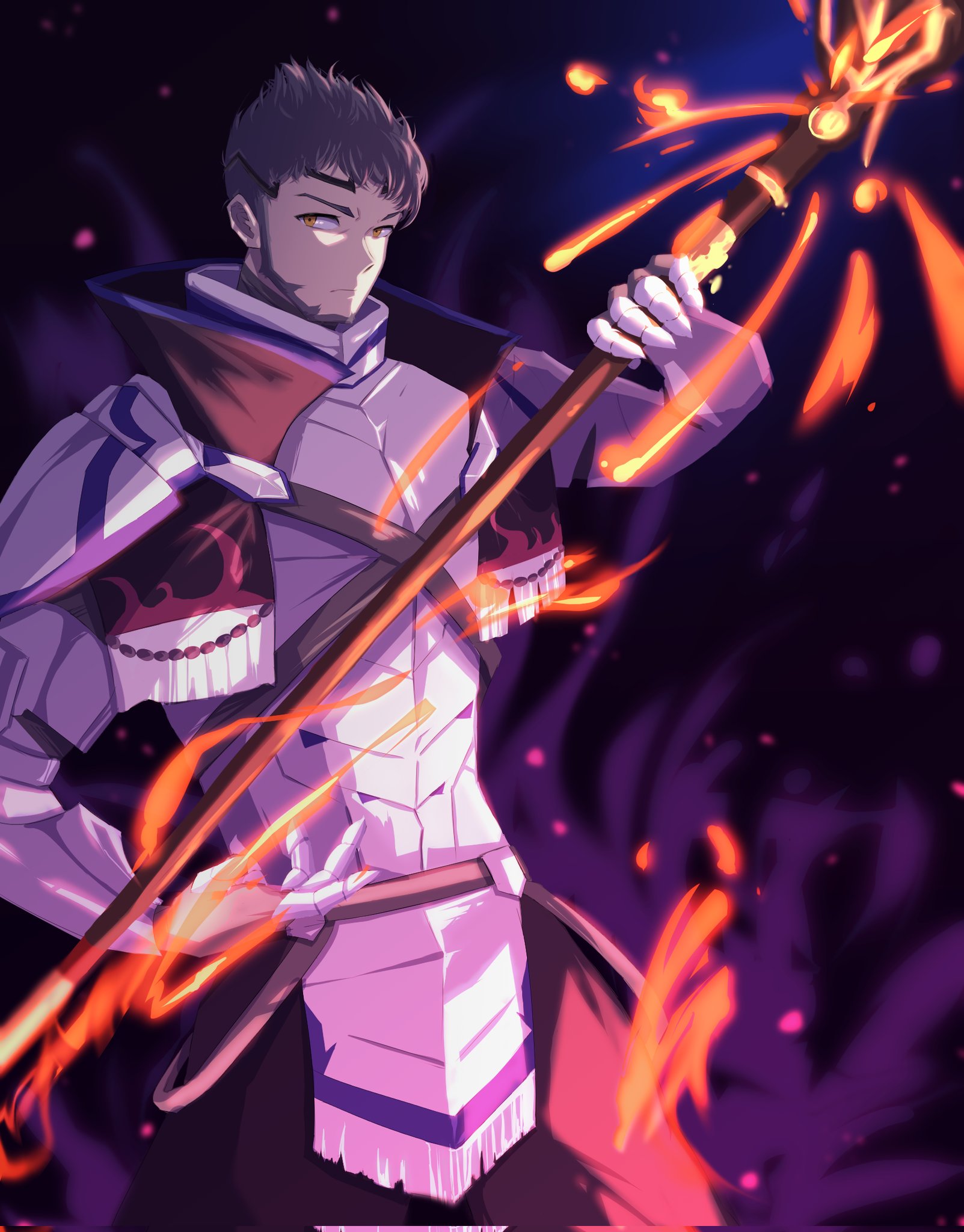 1boy beard black_hair facial_hair fire_emblem fire_emblem_engage grey_armor highres holding holding_polearm holding_weapon male_focus mauvier_(fire_emblem) nintendo polearm solo soypearl982 upper_body weapon