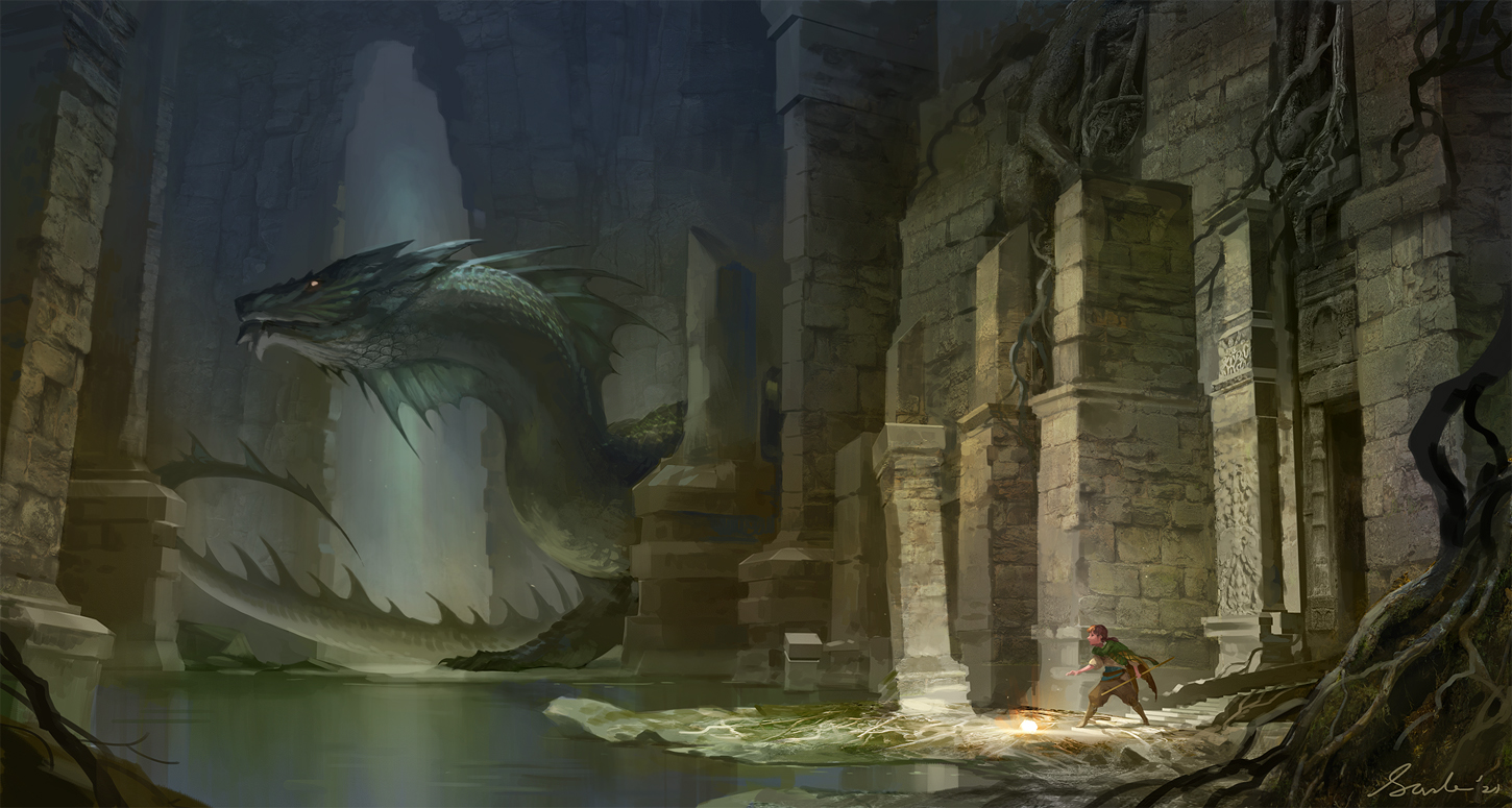 1boy animal_focus artist_name commentary dragon english_commentary fantasy fins giant giant_monster glowing glowing_eye head_fins monster original outdoors pillar plant_roots ruins sandara scales scenery signature size_difference stone_wall tail water wide_shot