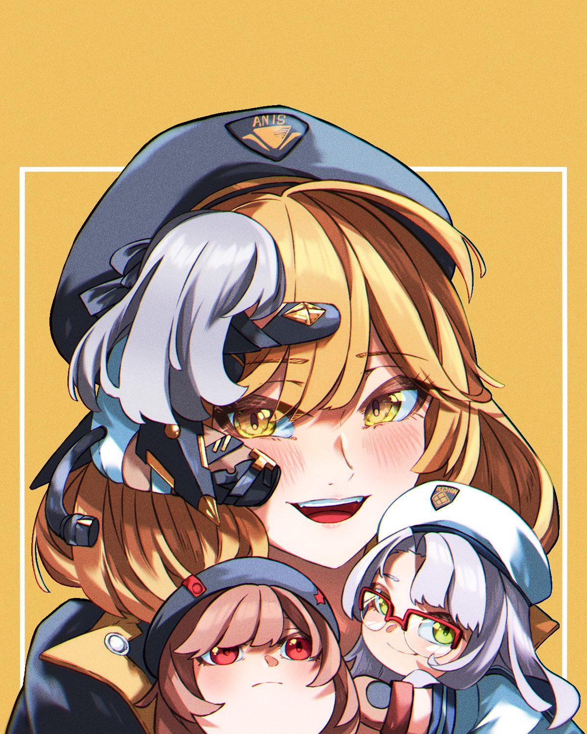 4girls :d ahoge amazora_cakel anis_(nikke) beret black_jacket blonde_hair blush brown_hair chibi frown glasses goddess_of_victory:_nikke grey_hair hat highres hug jacket long_hair mechanical_tail modernia_(nikke) multicolored_jacket multiple_girls neon_(nikke) open_mouth orange_jacket rapi_(nikke) red_eyes short_hair smile tail two-tone_jacket yellow_eyes