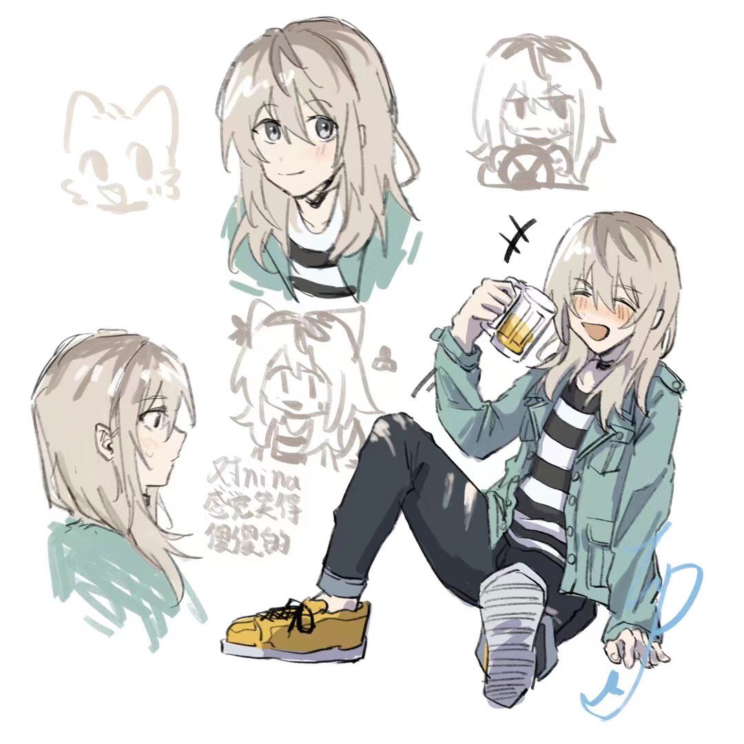 1girl ^_^ alcohol animal_ears animalization beer beer_mug black_pants black_shirt blue_jacket blush cat_ears chinese_text closed_eyes commentary cup english_commentary fish_(sakana135026) girls_band_cry grey_eyes grey_hair hair_between_eyes holding holding_cup jacket kawaragi_momoka kemonomimi_mode long_hair long_sleeves mug multicolored_hair multiple_views open_clothes open_jacket open_mouth pants roots_(hair) shirt shoes simple_background striped_clothes striped_shirt translation_request white_background white_shirt yellow_shoes