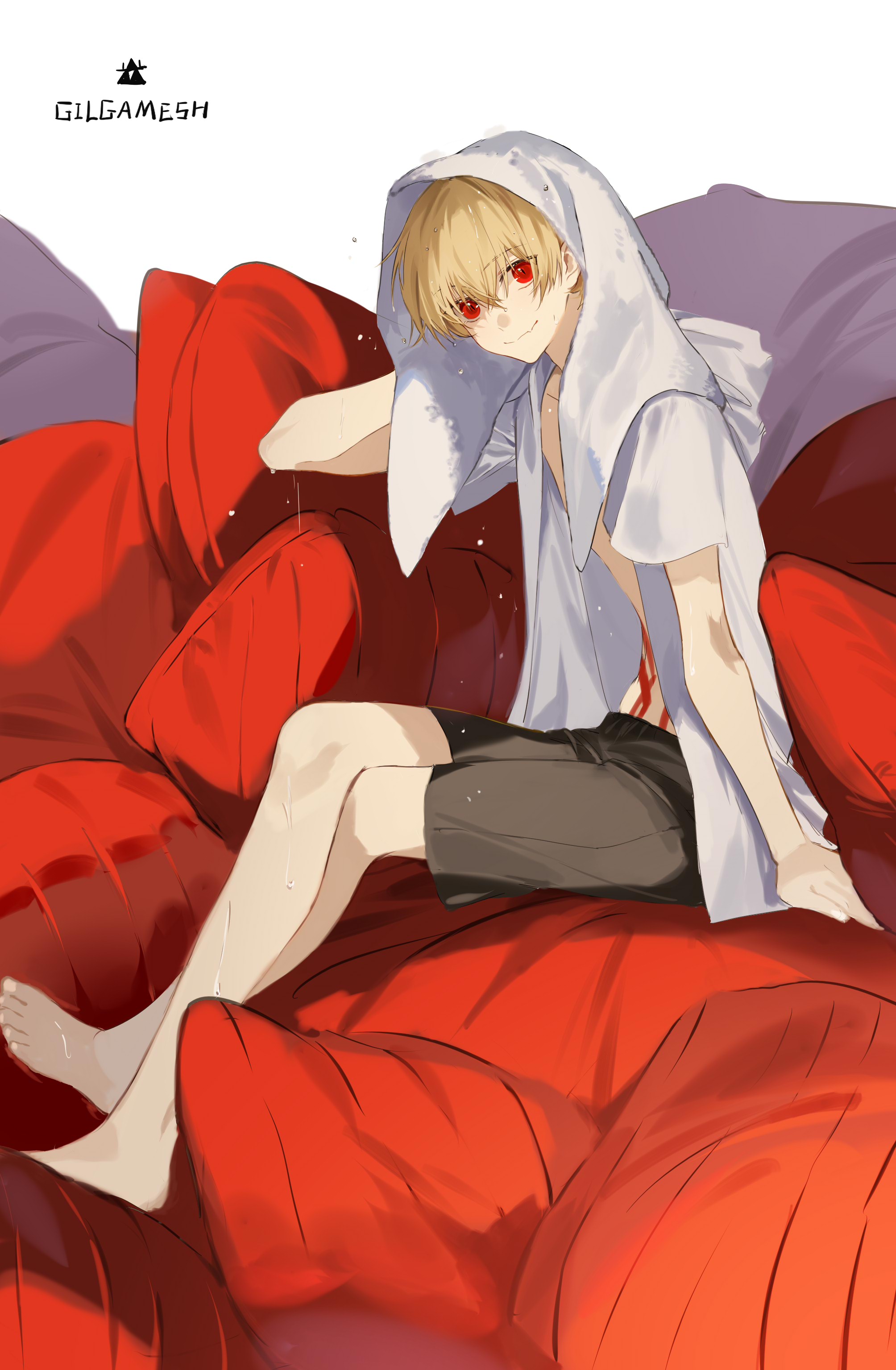 1boy absurdres blonde_hair bsq child child_gilgamesh_(fate) drying drying_hair drying_own_hair fate/grand_order fate/hollow_ataraxia fate/kaleid_liner_prisma_illya fate/stay_night fate_(series) gilgamesh_(fate) highres looking_at_viewer male_focus open_clothes open_shirt red_eyes shirt short_hair shorts sitting smile solo towel towel_on_head water wet wet_clothes wet_hair