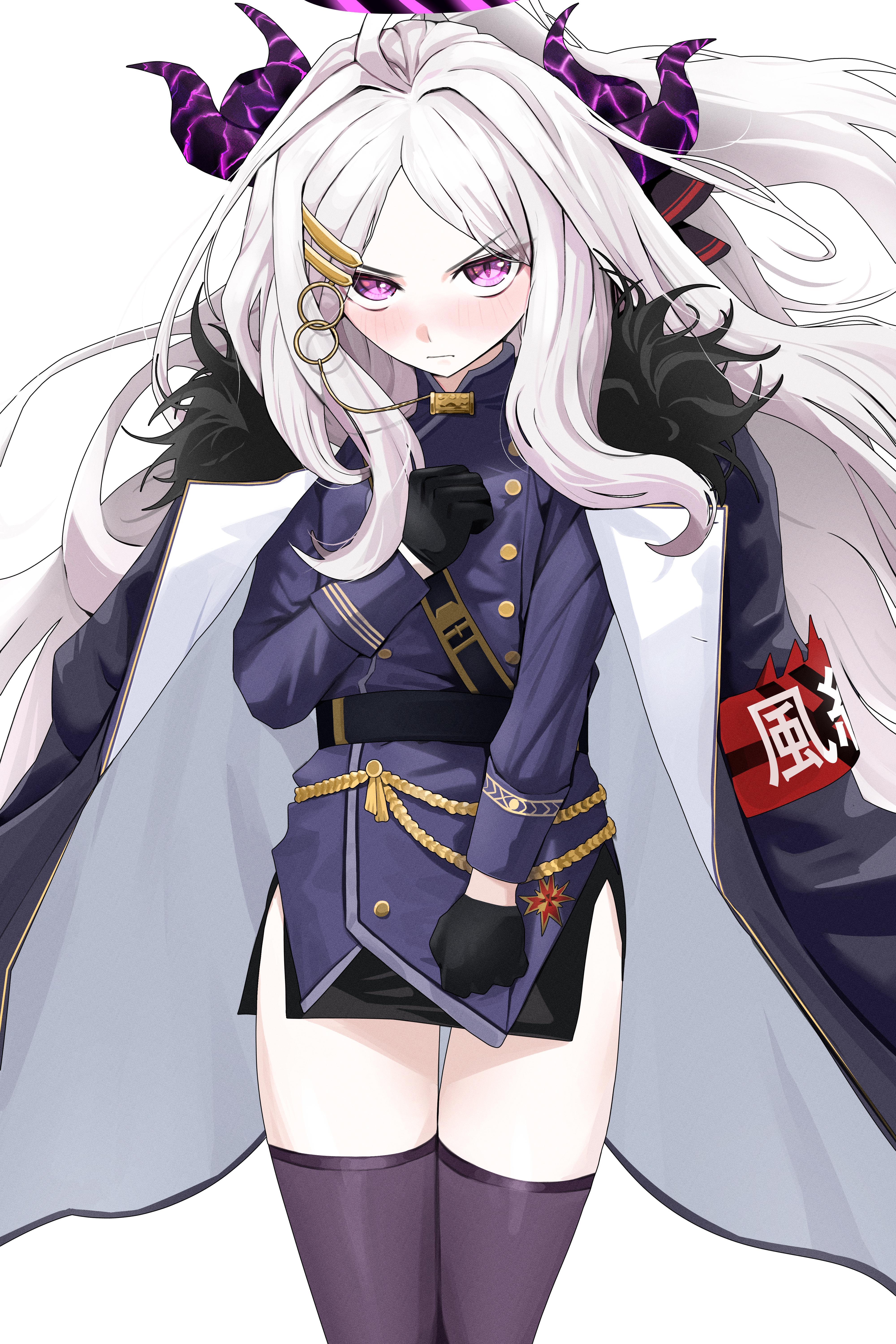 1girl :| absurdres ahoge aiguillette armband belt black_armband black_belt black_gloves black_halo black_horns black_skirt black_thighhighs blue_archive blush clenched_hands closed_mouth coat coat_on_shoulders commentary cowboy_shot demon_girl demon_horns english_commentary floating_clothes floating_hair furrowed_brow gloves hair_ornament hair_over_shoulder hairclip halo hand_on_own_chest highres hina_(blue_archive) horns long_hair long_sleeves looking_at_viewer military military_uniform miniskirt multicolored_armband multicolored_halo multicolored_horns multiple_horns open_clothes open_coat parted_bangs pencil_skirt purple_coat purple_eyes purple_halo purple_horns red_armband side_slit simple_background skirt solo thighhighs thighs two-tone_halo two-tone_horns white_armband white_background white_hair yulmu98999 zettai_ryouiki