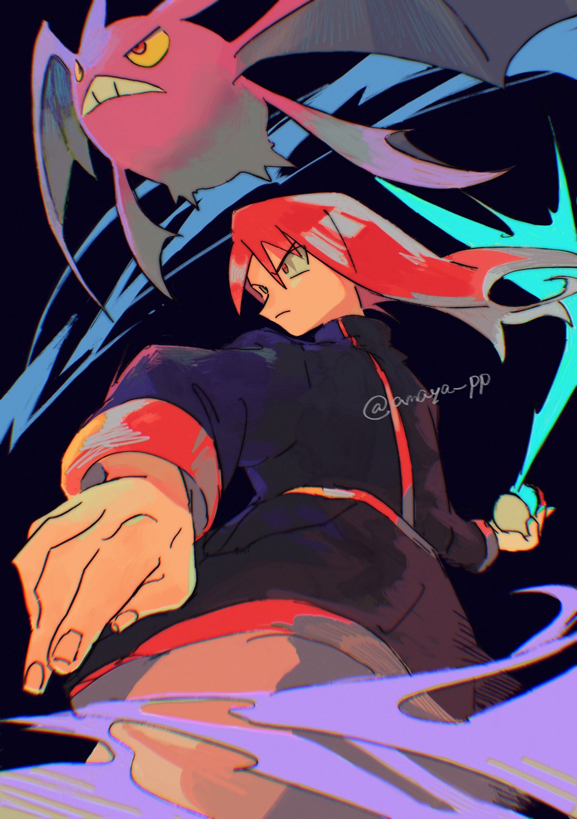 1boy amaya_uw black_background black_jacket closed_mouth crobat floating_hair from_below gen_2_pokemon hair_between_eyes highres holding holding_poke_ball jacket long_hair long_sleeves male_focus nintendo pants poke_ball poke_ball_(basic) pokemon pokemon_gold/silver/crystal red_hair silver_(pokemon) teeth twitter_username
