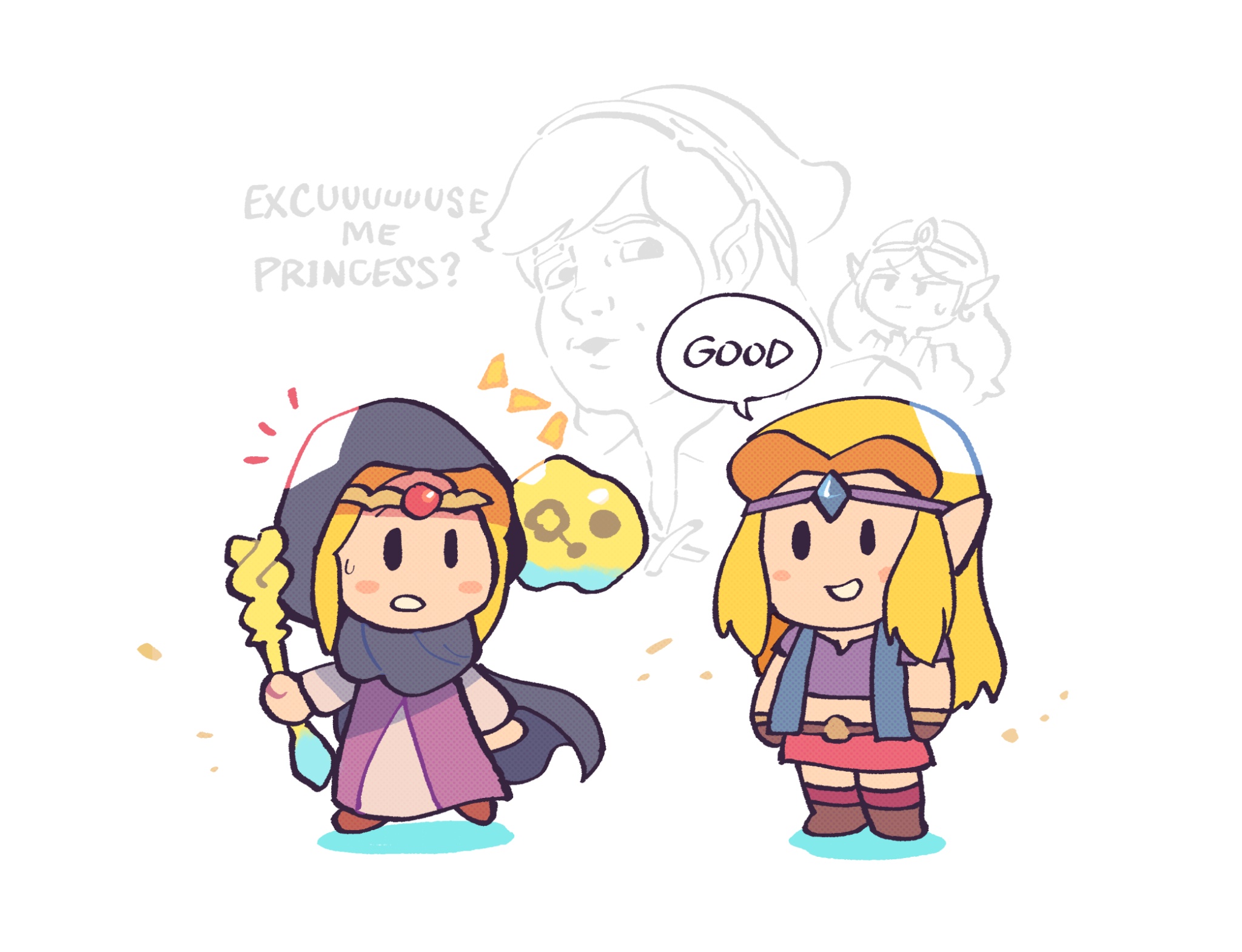 1boy 3girls blonde_hair chibi circlet cloak english_text excuse_me_princess_(meme) highres in-franchise_crossover link multiple_girls multiple_persona nintendo pointy_ears princess_zelda rariatto_(ganguri) simple_background speech_bubble the_legend_of_zelda the_legend_of_zelda:_echoes_of_wisdom the_legend_of_zelda_(cartoon) the_legend_of_zelda_(cd-i) zelda:_the_wand_of_gamelon