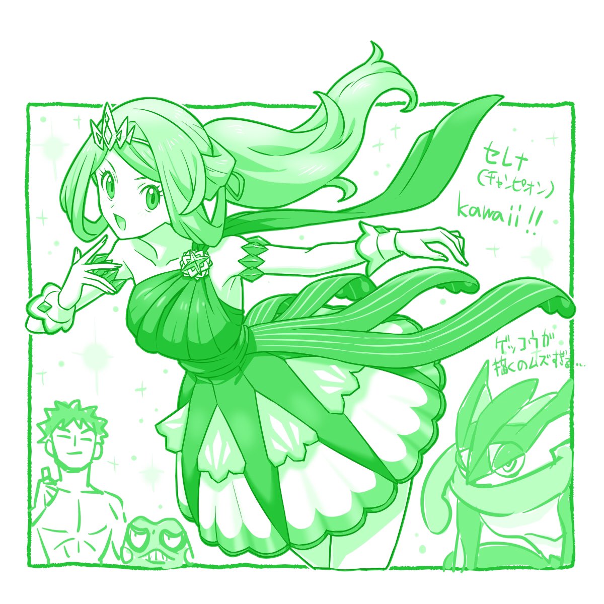 1boy 1girl :d armlet brock_(pokemon) collarbone commentary_request croagunk dress eyelashes floating_hair gen_4_pokemon gen_6_pokemon greninja hand_up highres jewelry kenchi leaning long_hair looking_at_viewer monochrome nintendo official_alternate_costume open_mouth outstretched_arm pokemon pokemon_(creature) pokemon_masters_ex pokemon_red/green/blue/yellow serena_(champion)_(pokemon) serena_(pokemon) single_strap smile wrist_cuffs