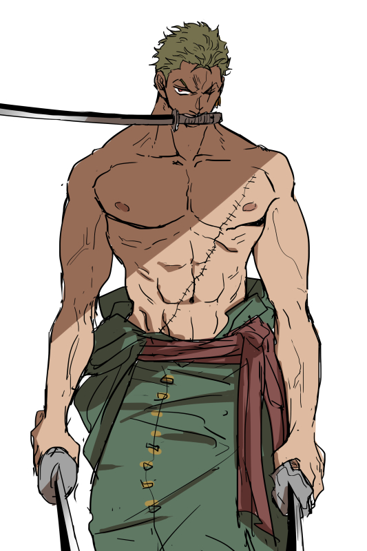 1boy abs commentary green_hair green_kimono holding holding_sword holding_weapon japanese_clothes kimono male_focus multiple_swords muscular muscular_male one_eye_closed one_piece roronoa_zoro sash scar scar_on_face shiba44469 simple_background solo stitched_torso stitches sword topless_male v-shaped_eyebrows weapon weapon_in_mouth white_background