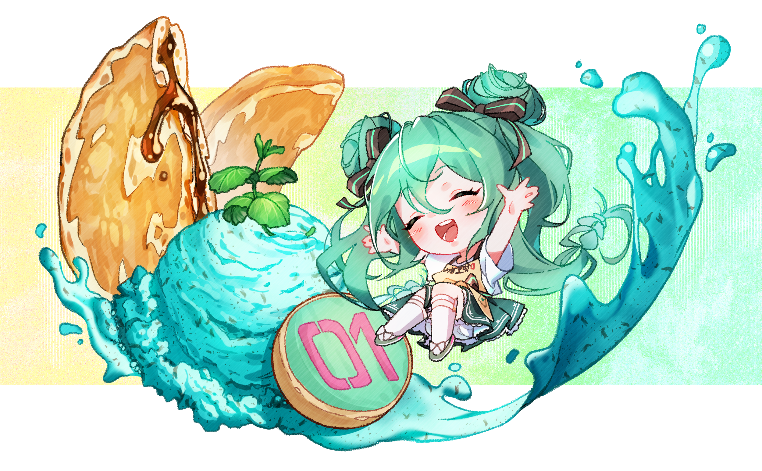 1girl ^_^ algamja apron arms_up black_ribbon bloomers blush border braid chibi chibi_only chocolate_syrup closed_eyes commentary_request double_bun food frilled_skirt frills fruit full_body gradient_background green_background green_footwear green_hair green_ribbon green_skirt hair_bun hair_ribbon hatsune_miku highres ice_cream kneehighs knees_up leaf legwear_garter long_hair open_mouth orange_(fruit) orange_background orange_slice outside_border outstretched_arms oversized_food oversized_object ribbon shirt short_sleeves simple_background sitting skirt smile socks solo striped_ribbon teeth tongue twin_braids two-tone_ribbon underwear very_long_hair vocaloid white_bloomers white_border white_shirt white_socks yellow_apron