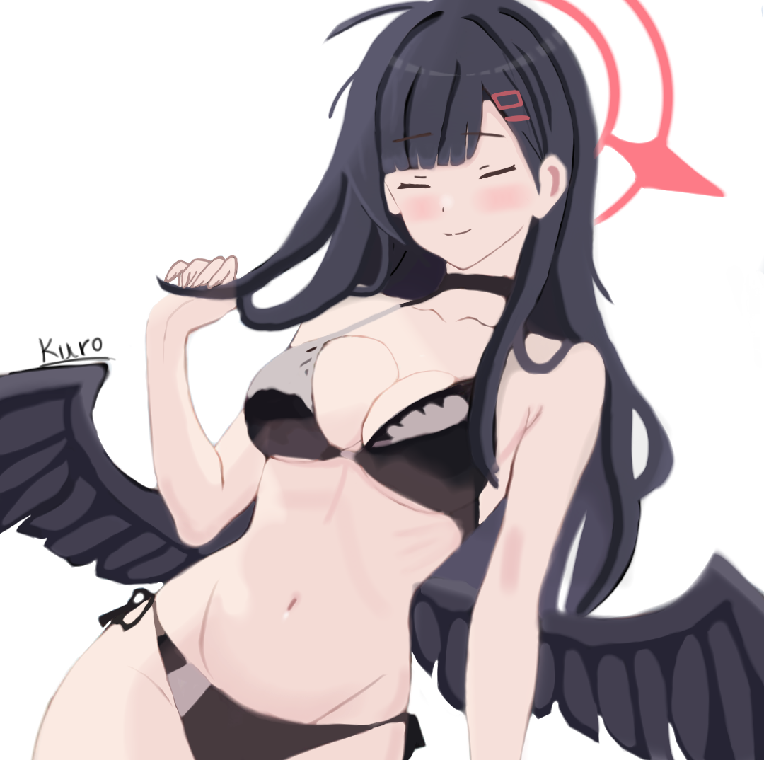 1girl artist_name bikini black_bikini blue_archive breasts closed_eyes closed_mouth collarbone halo ichika_(blue_archive) kurogami_fuyuki long_hair looking_at_viewer medium_breasts red_halo swimsuit wings