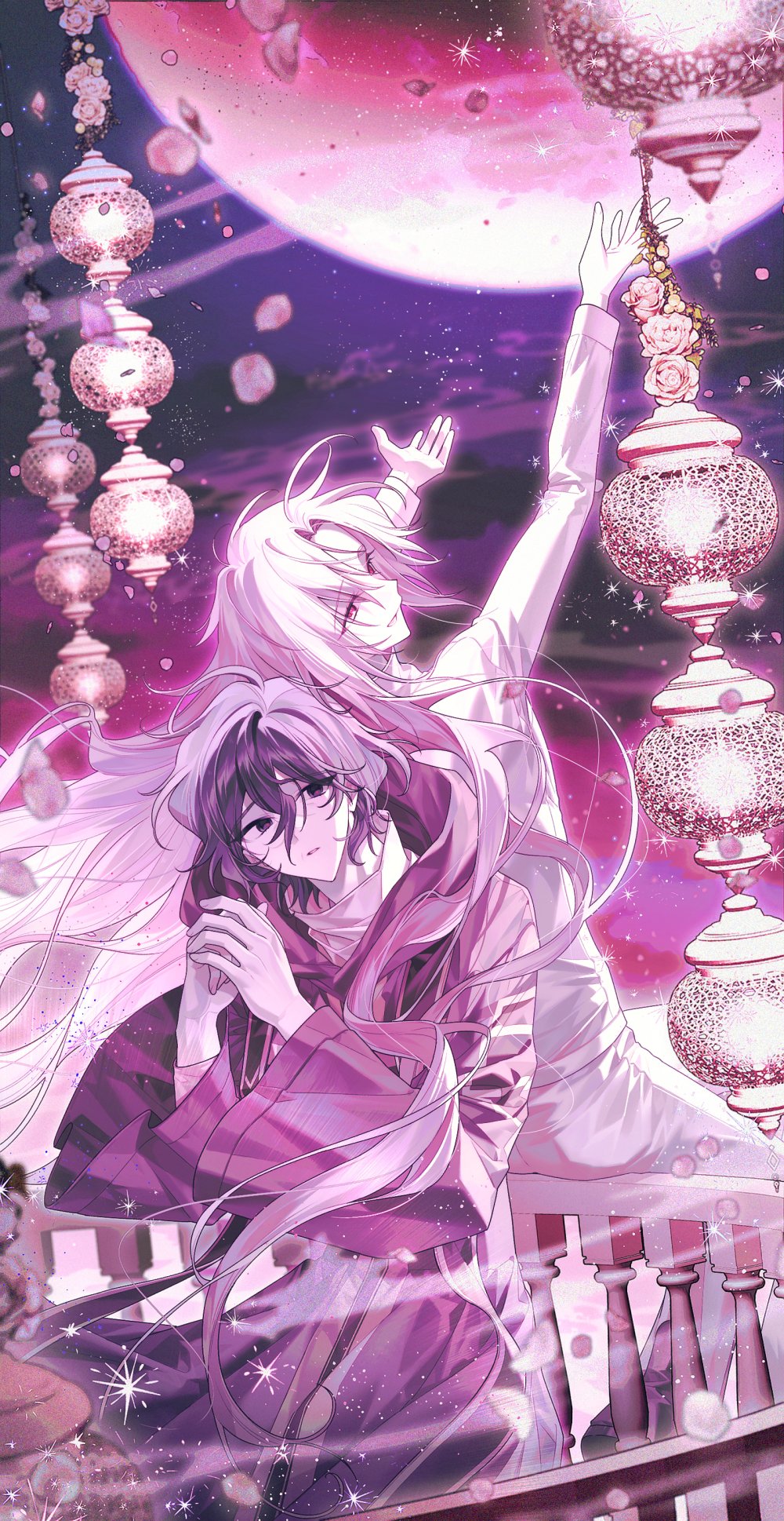 2boys arms_up commentary_request hatsutori_hajime high_collar highres hood hood_down hooded_robe korean_commentary long_hair male_focus moon multiple_boys night open_mouth outdoors pale_skin pants parted_bangs pink_hair pink_theme purple_eyes purple_hair purple_robe red_eyes robe saibou_shinkyoku shirt short_hair sitting smile sparkle tong_gog_gm utsugi_noriyuki white_pants white_shirt