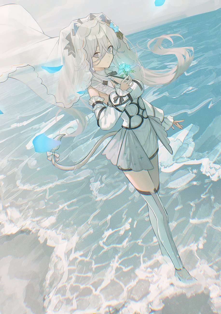 1girl :/ ahoge animal_ear_piercing animal_ears beach black_ribbon blue_petals bow breasts closed_mouth cloud cloudy_sky collar commentary_request corset detached_collar detached_sleeves dress ear_covers floating_hair flower frilled_collar frilled_dress frills full_body grey_eyes grey_hair hair_ribbon high_collar highres holding holding_flower hololive large_breasts lion_ears lion_girl lion_tail long_bangs long_hair long_sleeves looking_at_viewer neck_ribbon nemophila_(flower) ocean official_alternate_costume official_alternate_hairstyle petals puffy_long_sleeves puffy_sleeves ribbed_dress ribbon shishiro_botan shishiro_botan_(5th_costume) short_dress sidelocks sky sleeve_garter solo standing star_(sky) starry_sky swept_bangs tail tail_bow tail_ornament thighhighs twintails veil virtual_youtuber wading white_bow white_corset white_dress white_footwear white_thighhighs xyunx