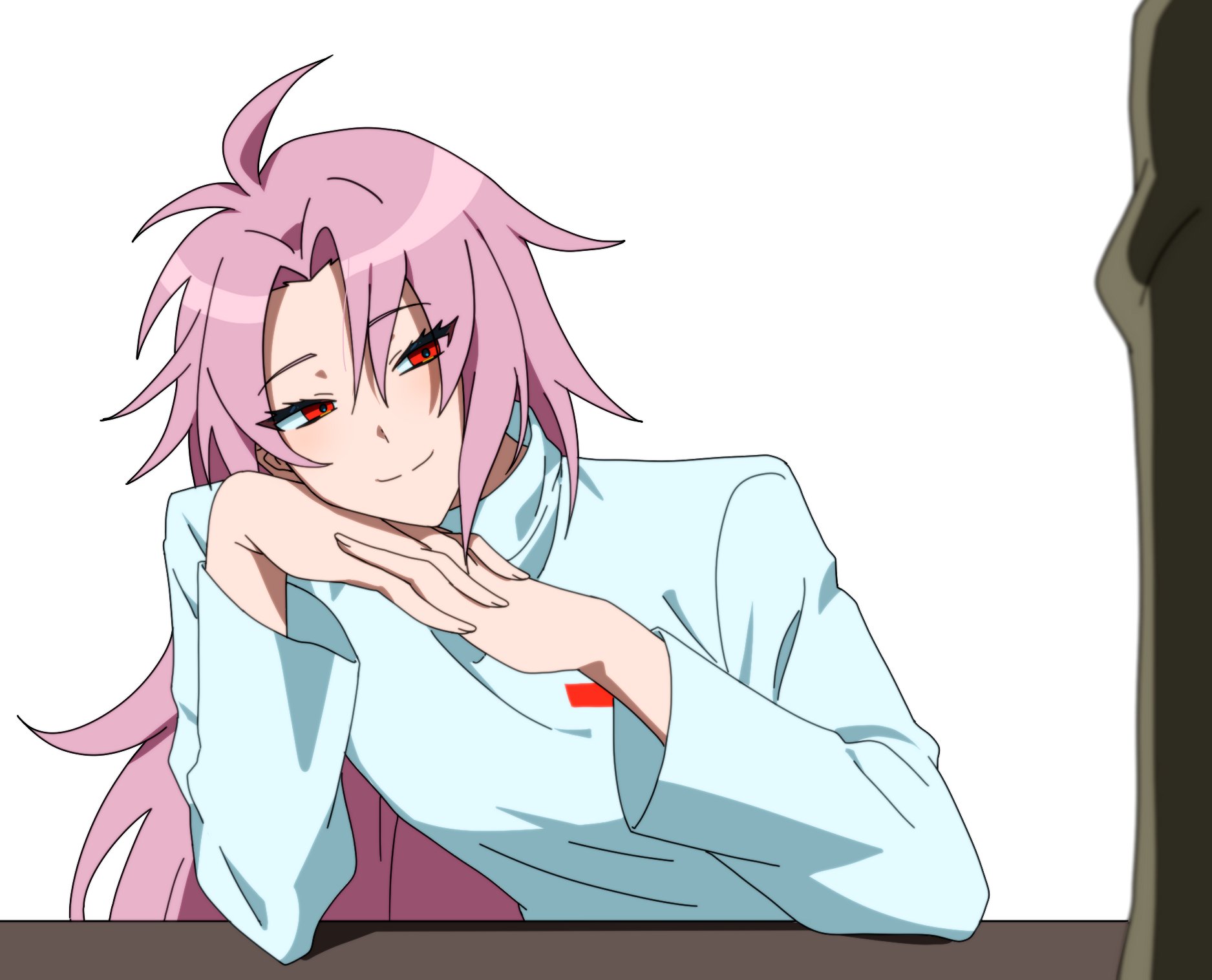 2boys ahoge closed_mouth eyes_visible_through_hair hatsutori_hajime high_collar highres long_hair male_focus multiple_boys out_of_frame own_hands_together parted_bangs pink_hair red_eyes saibou_shinkyoku shirt simple_background smile solo_focus tong_gog_gm utsugi_noriyuki white_background white_shirt
