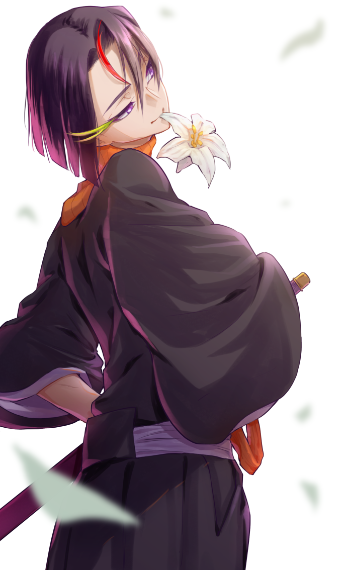 1boy ayasegawa_yumichika black_hair black_kimono bleach blunt_ends blurry bob_cut closed_mouth commentary_request cowboy_shot depth_of_field falling_petals flower flower_in_mouth hair_between_eyes hand_on_own_hip head_tilt japanese_clothes katana kimono long_sleeves looking_afar male_focus medium_hair petals purple_eyes simple_background solo soraao0322 straight_hair sword tsurime weapon white_background white_flower white_lily wide_sleeves