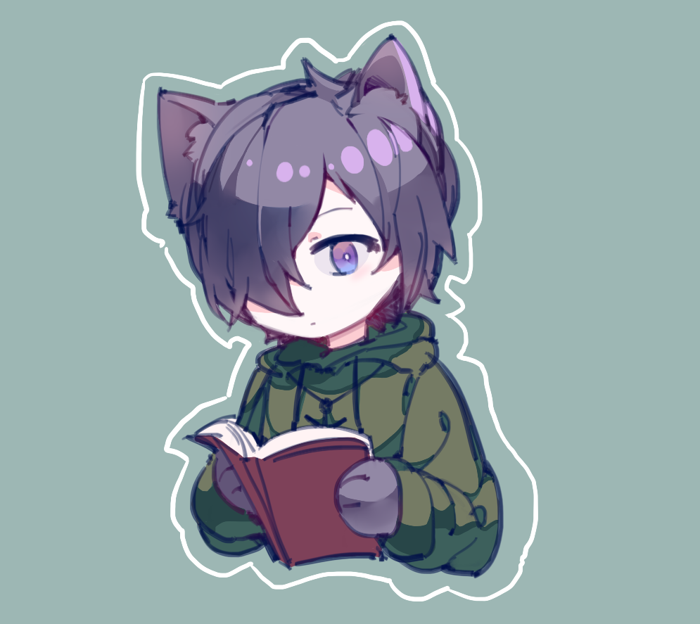 1boy aiba_ibuki animal_ear_fluff animal_hands aqua_background book bright_pupils cat_boy chinese_commentary closed_mouth commentary_request green_hoodie hair_over_one_eye holding holding_book hood hood_down hoodie jewelry kemonomimi_mode long_sleeves male_focus necklace purple_eyes purple_hair saibou_shinkyoku short_hair simple_background solo upper_body white_pupils yin_rouhi