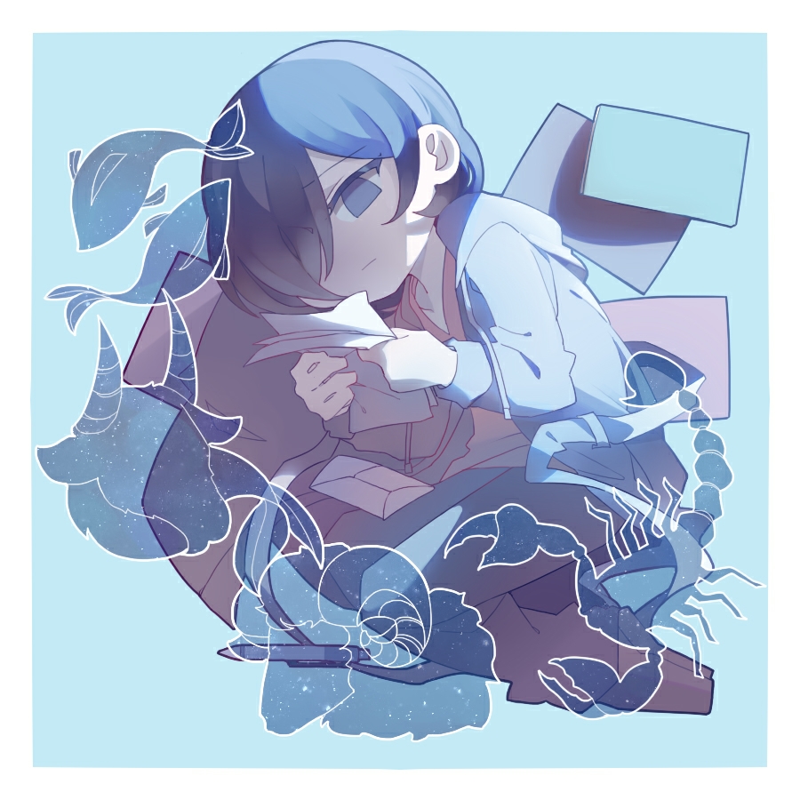 1boy aiba_ibuki blue_eyes blue_hair blue_jacket border brown_pants brown_shirt capricorn_(zodiac) closed_mouth commentary_request deformed holding holding_paper hood hood_down hooded_jacket jacket long_sleeves lying male_focus no_nose on_side pants paper papers pisces_(symbol) saibou_shinkyoku scorpio_(zodiac) shirt solo taurus_(zodiac) white_border yin_rouhi zodiac