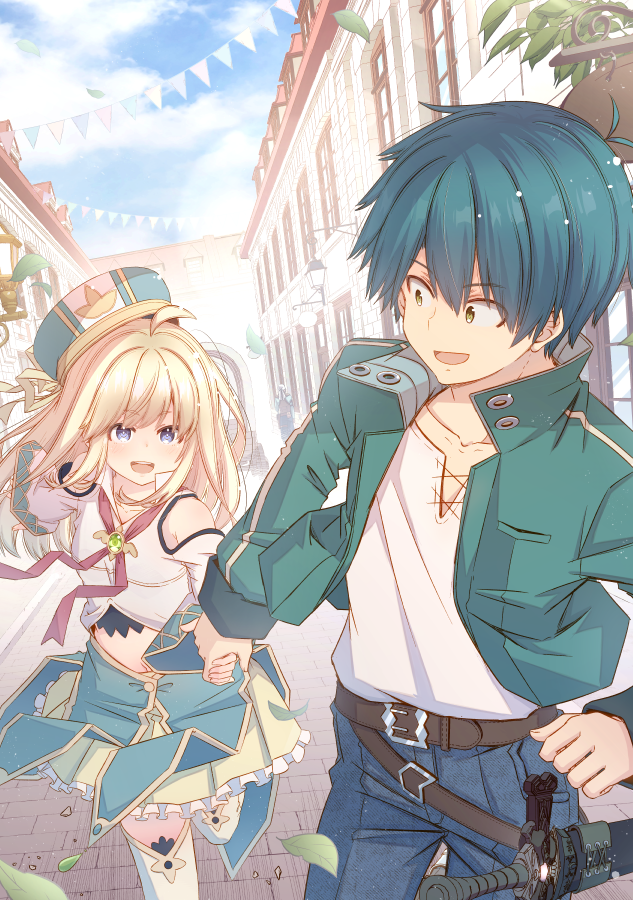 1boy 1girl :d attouteki_gacha_un_de_isekai_wo_nariagaru! belt belt_buckle blonde_hair blue_eyes blue_hair blue_hat blue_pants blue_sky brown_belt buckle building clothing_cutout cloud cloudy_sky collarbone commentary_request day frilled_skirt frills fujisaki_yuu green_eyes green_jacket green_skirt hair_between_eyes hat holding_hands jacket kazami_jinta leafa_(attogacha) long_hair open_clothes open_jacket open_mouth outdoors pants pennant pleated_skirt running sheath sheathed shirt shoulder_cutout skirt sky smile string_of_flags sweat thighhighs very_long_hair wall_lamp white_shirt white_thighhighs window