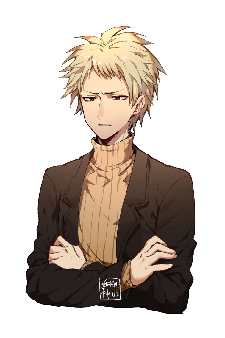 1boy atou_haruki black_jacket blonde_hair chinese_commentary commentary_request copyright_name inari_(rabbit292) jacket long_sleeves male_focus open_clothes open_jacket orange_sweater red_eyes ribbed_sweater saibou_shinkyoku short_hair simple_background solo sweater translated turtleneck turtleneck_sweater upper_body white_background