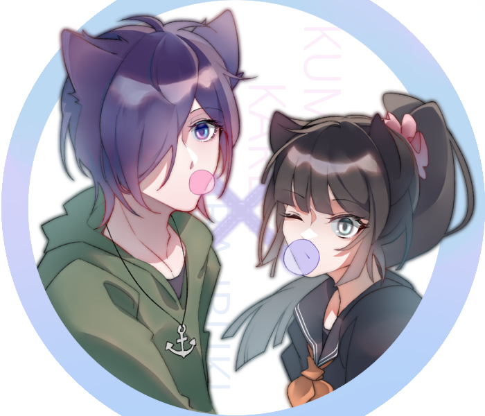1boy 1girl aiba_ibuki animal_ears black_shirt cat_boy cat_ears cat_girl character_name chewing_gum chinese_commentary commentary_request green_hoodie grey_eyes hair_over_one_eye hood hood_down hoodie kemonomimi_mode kumazaki_karen long_hair multicolored_eyes neckerchief official_alternate_costume one_eye_closed ponytail purple_hair red_neckerchief saibou_shinkyoku sailor_collar sailor_shirt scrunchie shirt short_hair yin_rouhi