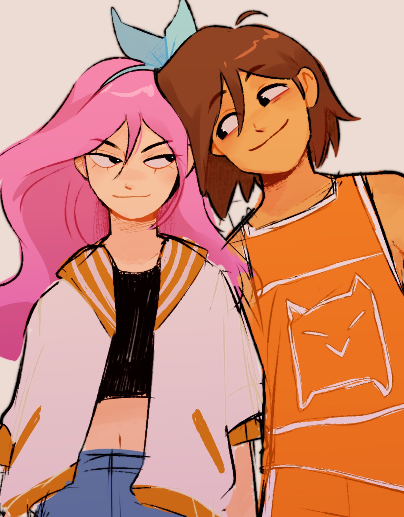 1boy 1girl aubrey_(faraway)_(omori) aubrey_(omori) blue_skirt brown_hair closed_mouth crop_top dark-skinned_male dark_skin darmicy denim denim_skirt hairband highres jacket kel_(faraway)_(omori) kel_(omori) long_hair looking_at_another navel omori pink_hair short_hair short_sleeves skirt smile white_jacket