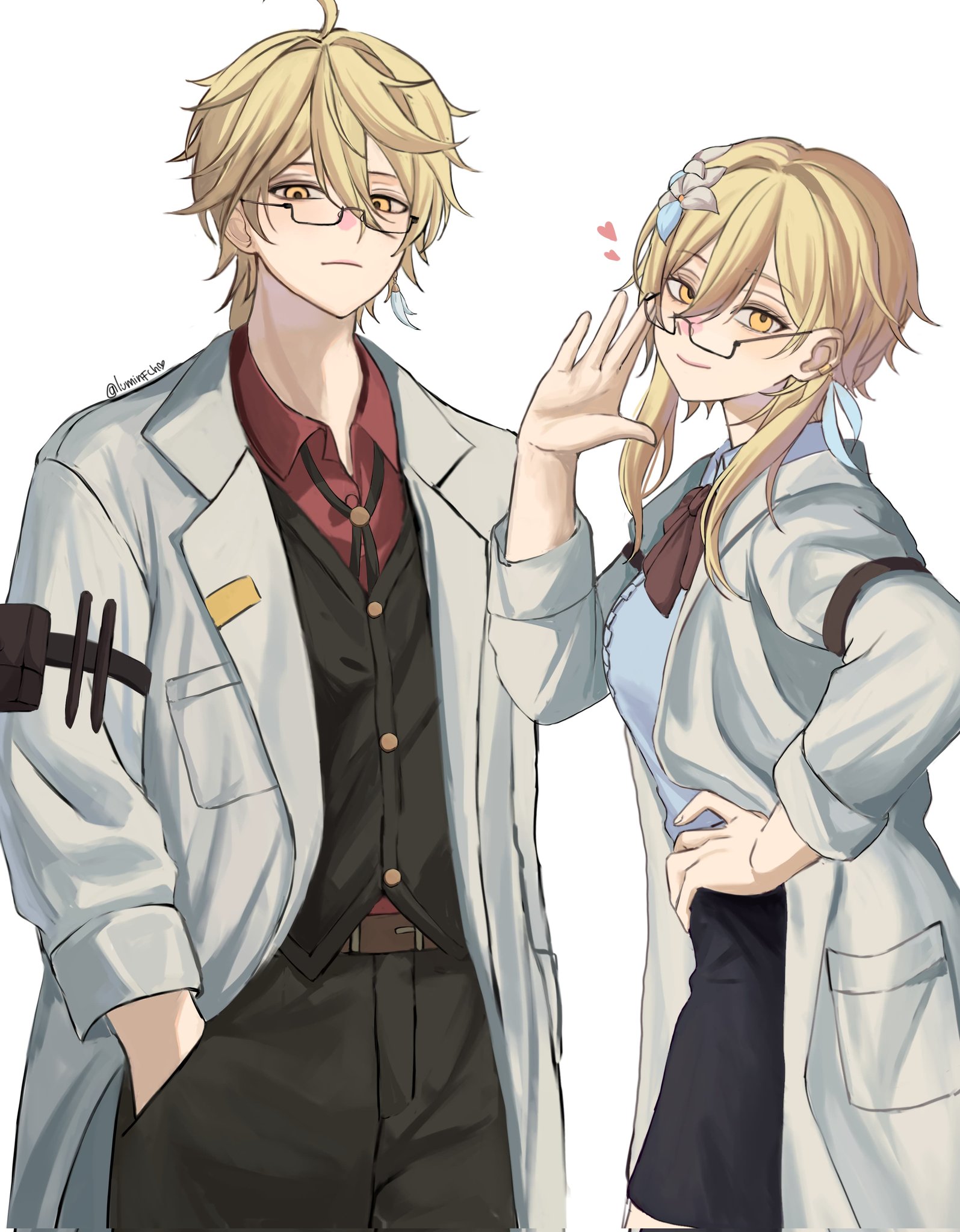 1boy 1girl aether_(genshin_impact) aether_(marechaussee_hunter)_(genshin_impact) black_pants black_skirt black_vest blonde_hair blue_shirt breasts brother_and_sister closed_mouth earrings flower genshin_impact glasses hair_between_eyes hair_flower hair_ornament highres jacket jewelry long_hair long_sleeves looking_at_viewer lumine_(genshin_impact) lumine_(marechaussee_hunter)_(genshin_impact) luminfch medium_breasts pants red_shirt shirt siblings skirt smile vest white_jacket yellow_eyes