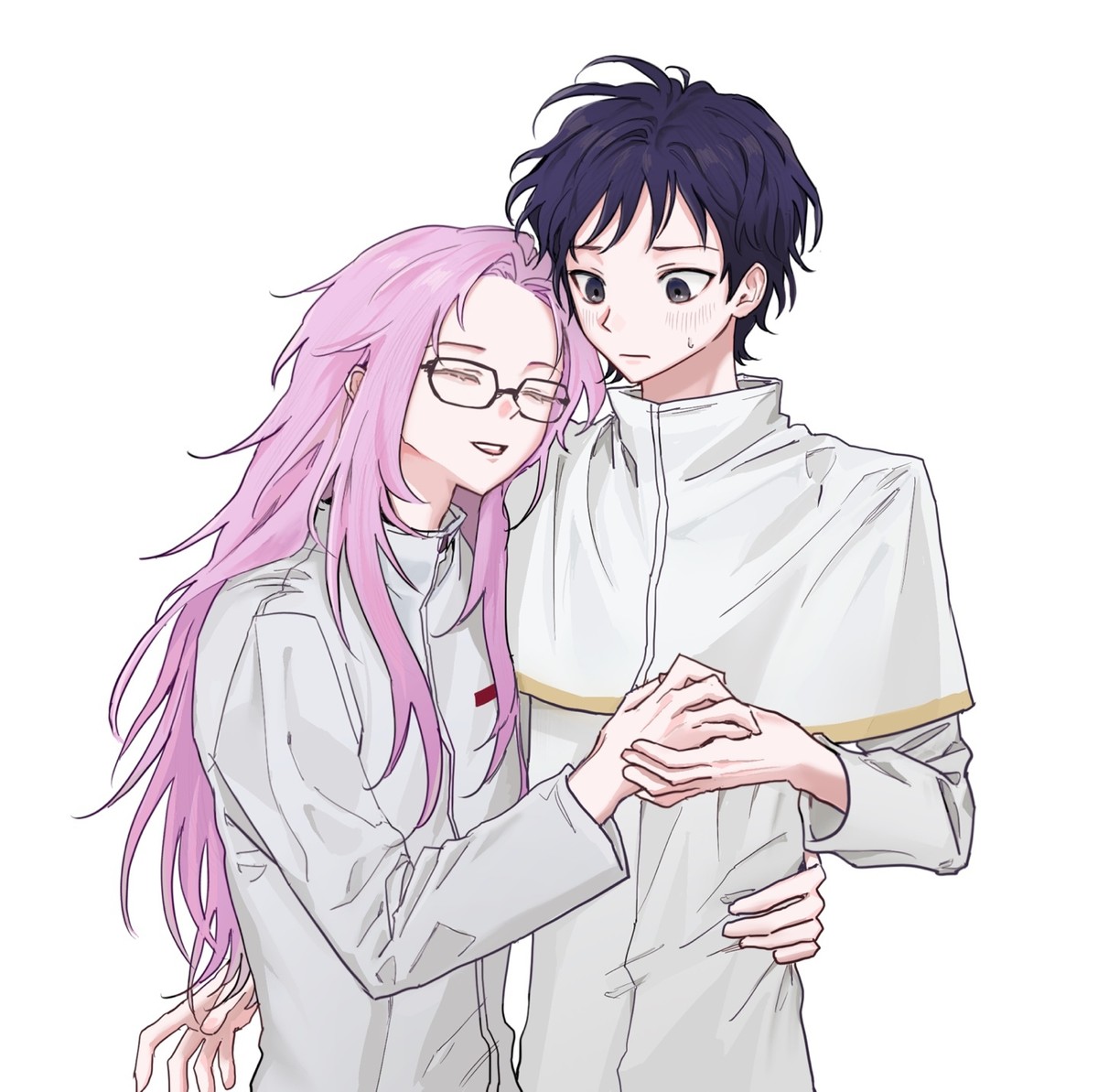 2boys black_eyes blue_hair capelet closed_eyes commentary_request dark_blue_hair glasses gold_trim hatsutori_hajime henohenomoheji_(tpvtlsrp) high_collar holding_hands korean_commentary long_hair long_sleeves male_focus multiple_boys open_mouth parted_lips pink_hair saibou_shinkyoku shirt short_hair simple_background smile sweat utsugi_noriyuki white_background white_capelet white_shirt