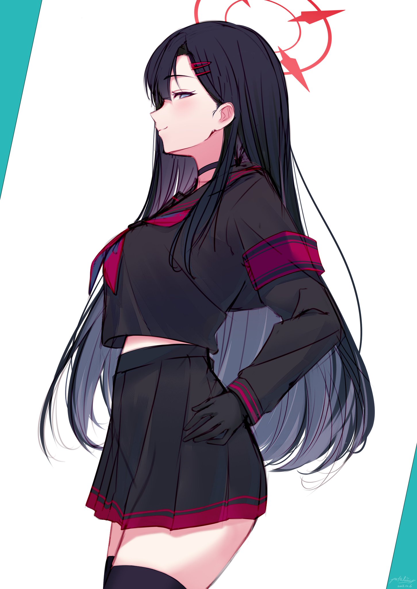 1girl armband black_choker black_hair black_sailor_collar black_serafuku black_skirt black_thighhighs blue_archive blush breasts choker closed_mouth cowboy_shot from_side grey_eyes hair_ornament hairclip halo highres ichika_(blue_archive) long_hair long_sleeves looking_at_viewer medium_breasts neckerchief pleated_skirt profile red_armband red_halo red_neckerchief sailor_collar school_uniform serafuku skirt smile solo thighhighs yata_mawari