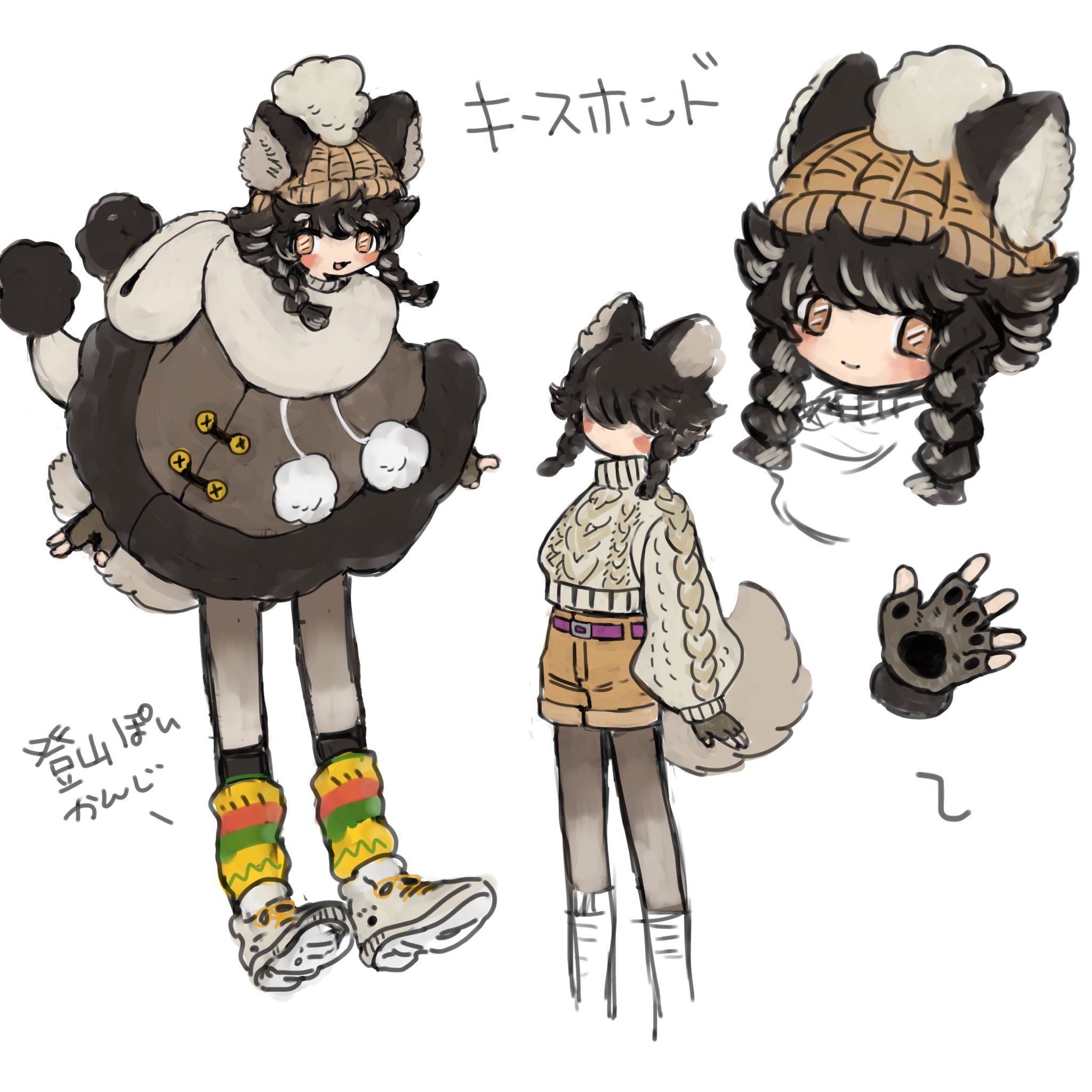 1boy animal_ears beanie braid brown_eyes brown_gloves brown_hair brown_hat brown_pantyhose brown_shorts brown_sweater reference_sheet closed_mouth commentary_request dog_boy dog_ears dog_tail ears_through_headwear fingerless_gloves full_body fur-trimmed_poncho gloves hat highres leg_warmers long_sleeves looking_at_viewer male_focus multicolored_hair multiple_views original pantyhose paw_print_palms poncho shima_(wansyon144) shoes shorts simple_background smile sneakers streaked_hair sweater tail translation_request trap twin_braids white_background