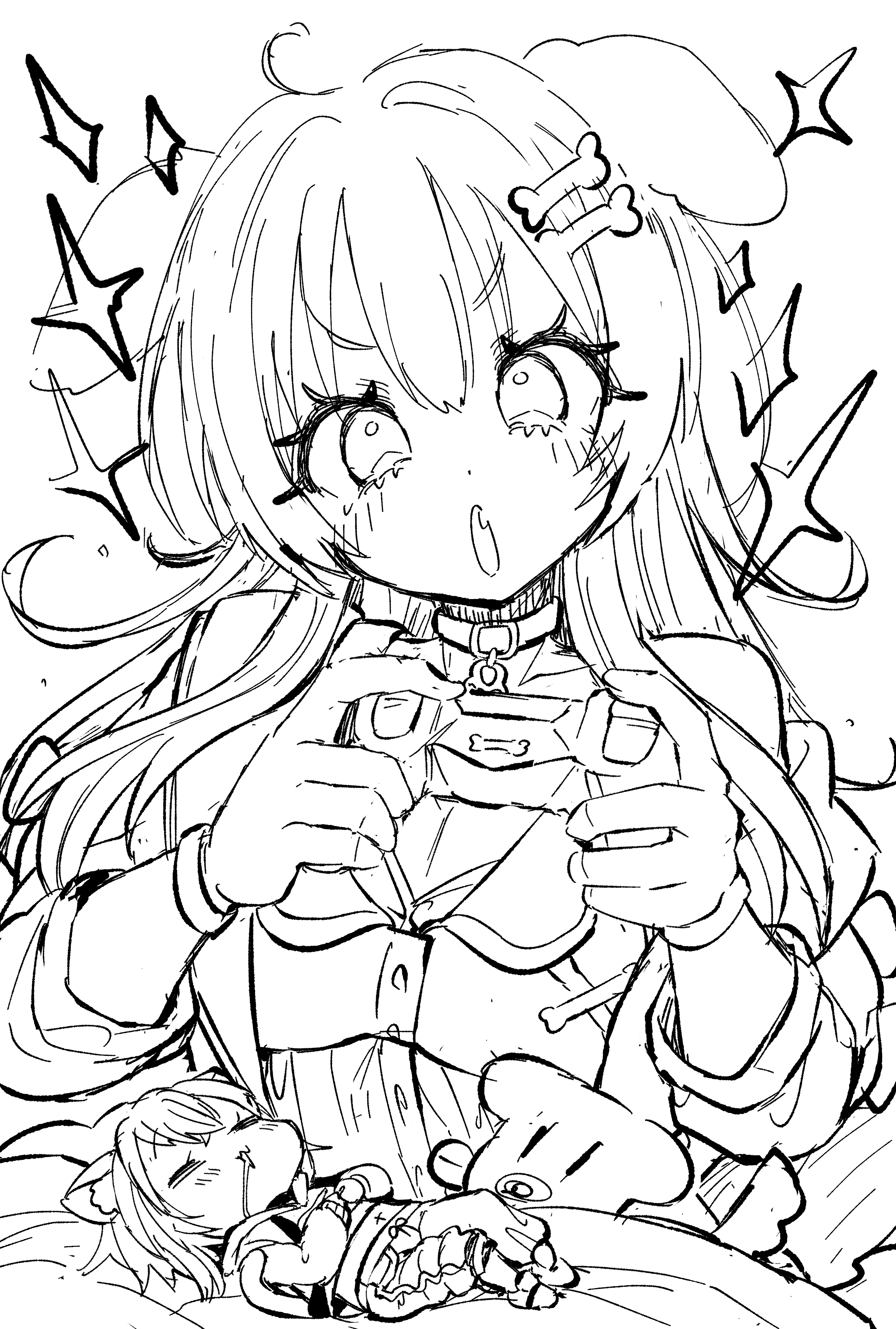 2girls absurdres animal_ears cat_ears cat_girl cat_tail choker controller dog_ears dog_girl drooling embarrassed eyelashes greyscale highres holding holding_controller hololive hoso-inu inugami_korone kamiya_zuzu long_sleeves looking_at_viewer lying monochrome mouth_drool multiple_girls nekomata_okayu on_back open_mouth sketch sleeping sparkle tail virtual_youtuber