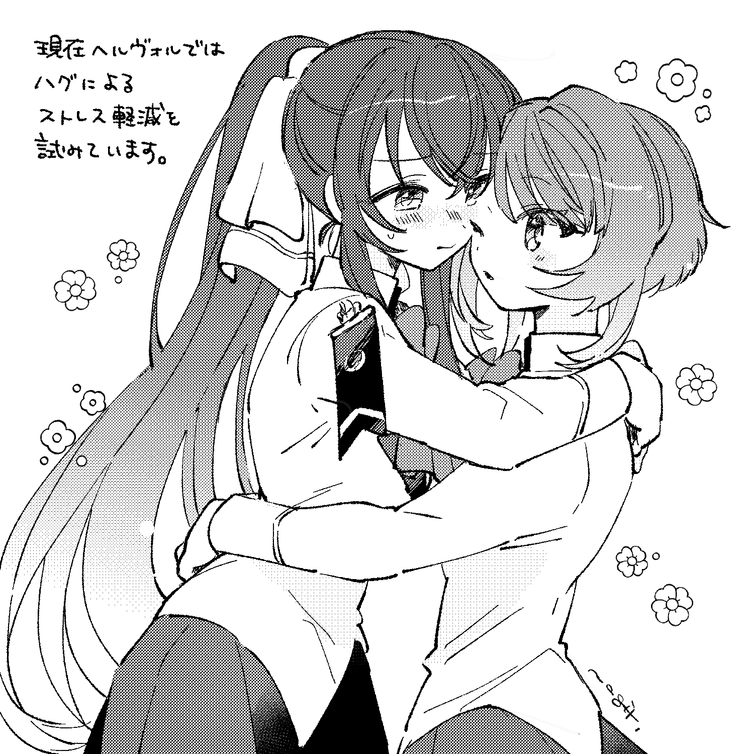 2girls aizawa_kazuha assault_lily blush bow bowtie closed_mouth commentary cowboy_shot crossed_bangs face-to-face flower_symbol greyscale hair_between_eyes hair_bow hand_up heads_together herensuge_girls_academy_school_uniform high_ponytail highres hug jacket long_hair long_sleeves looking_at_another monochrome multiple_girls mutual_hug nagi_(namae11x) one_eye_closed ponytail school_uniform serizawa_chikaru short_hair simple_background skirt standing sweatdrop untranslatable_commentary translation_request very_long_hair white_background yuri