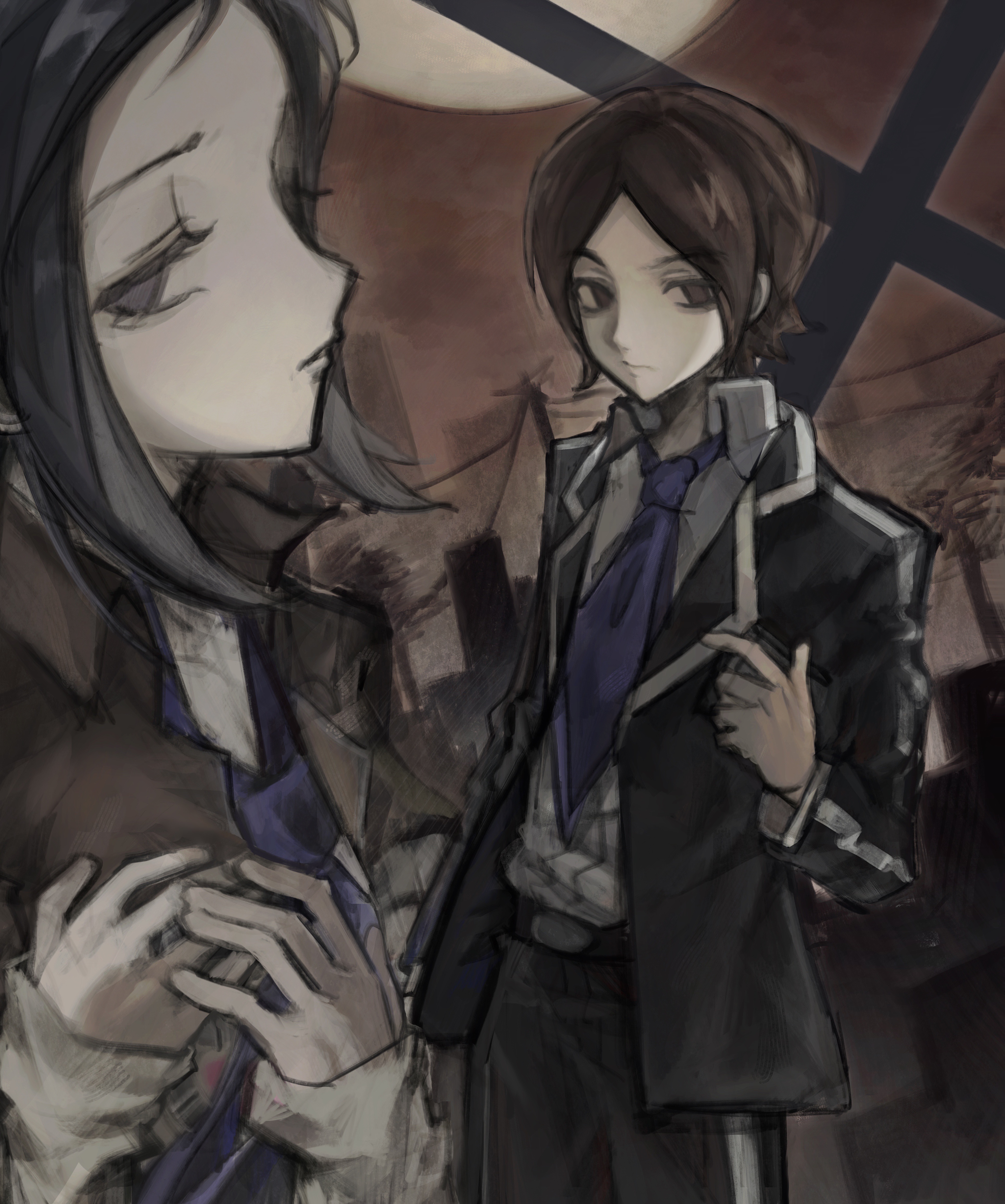 1boy 1girl absurdres amano_maya belt black_belt black_eyes black_hair black_jacket black_pants blue_necktie brown_eyes brown_hair closed_mouth collared_shirt highres jacket long_sleeves necktie nib_pen_(medium) pants parted_bangs pen_(medium) persona persona_2 shirt suou_tatsuya traditional_media white_shirt women_tao_ba