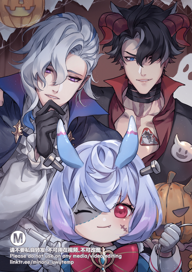 1girl 2boys animal_ears artist_name asymmetrical_bangs bandaged_neck bandages black_gloves black_hair blue_cape blue_eyes blue_hair blush bow bowtie brooch candy cape closed_mouth collarbone collared_cape collared_shirt commentary crossed_bangs demon_horns earrings english_commentary eyelashes facial_scar fang fang_out food frilled_sleeves frills genshin_impact ghost gloves gradient_hair grey_hair hair_between_eyes hair_ornament hair_over_one_eye halloween halloween_bucket halloween_costume hand_up hands_up holding holding_syringe horns jack-o'-lantern jewelry light_particles long_sleeves looking_at_viewer looking_down low_twintails medium_hair minoru_(minoru_uwutemp) multicolored_hair multiple_boys neuvillette_(genshin_impact) object_through_head one_eye_closed parted_bangs parted_lips pointy_ears pom_pom_(clothes) pom_pom_hair_ornament popped_collar puffy_long_sleeves puffy_sleeves pumpkin purple_eyes purple_hair red_bow red_bowtie red_eyes red_horns red_shirt scar scar_on_cheek scar_on_face scar_on_neck screw screw_in_head shirt short_eyebrows short_hair sidelocks sigewinne_(genshin_impact) silk smile spider_web sticker stitched_face stitches streaked_hair stud_earrings syringe twintails upper_body v-shaped_eyebrows watermark web_address white_gloves white_hair white_shirt wriothesley_(genshin_impact)