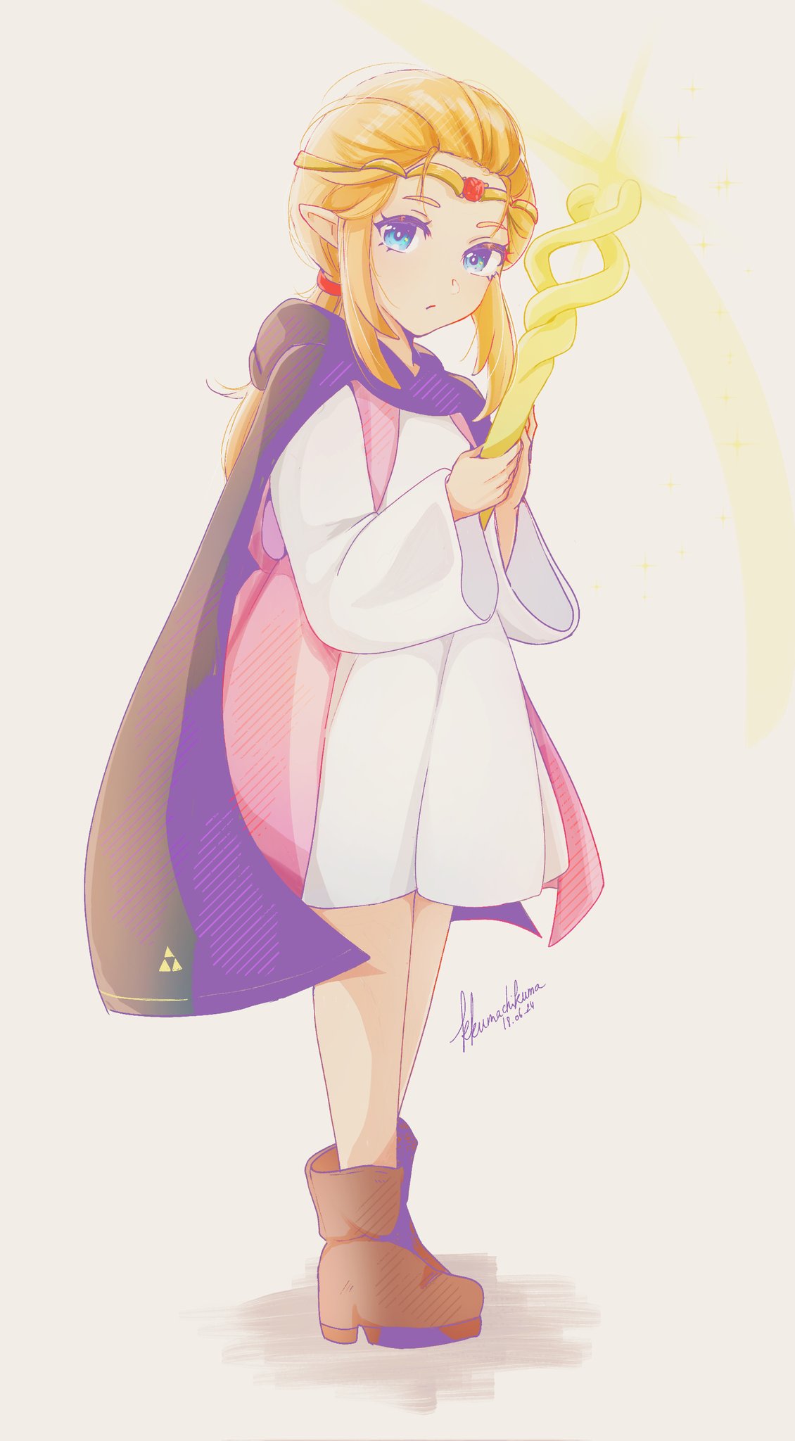 1girl black_cloak blonde_hair blue_eyes boots brown_boots circlet cloak gold_circlet hair_pulled_back highres hood hooded_cloak kkumachi long_hair long_sleeves looking_at_viewer mage_staff nintendo pointy_ears ponytail princess_zelda signature simple_background solo solo_focus staff the_legend_of_zelda the_legend_of_zelda:_echoes_of_wisdom tri_rod triforce_print white_background