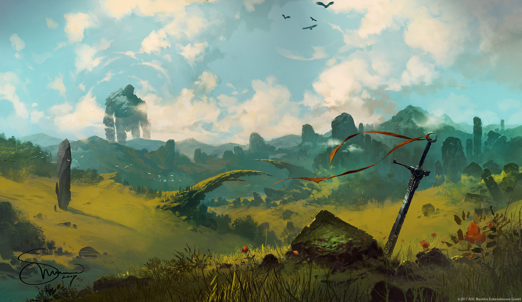blue_sky cloud cloudy_sky commentary company_name day english_commentary field golem grass highres landscape magic:_the_gathering mountainous_horizon no_humans official_art outdoors planted planted_sword planted_weapon rock scenery signature simple_bird sky sword velinov weapon