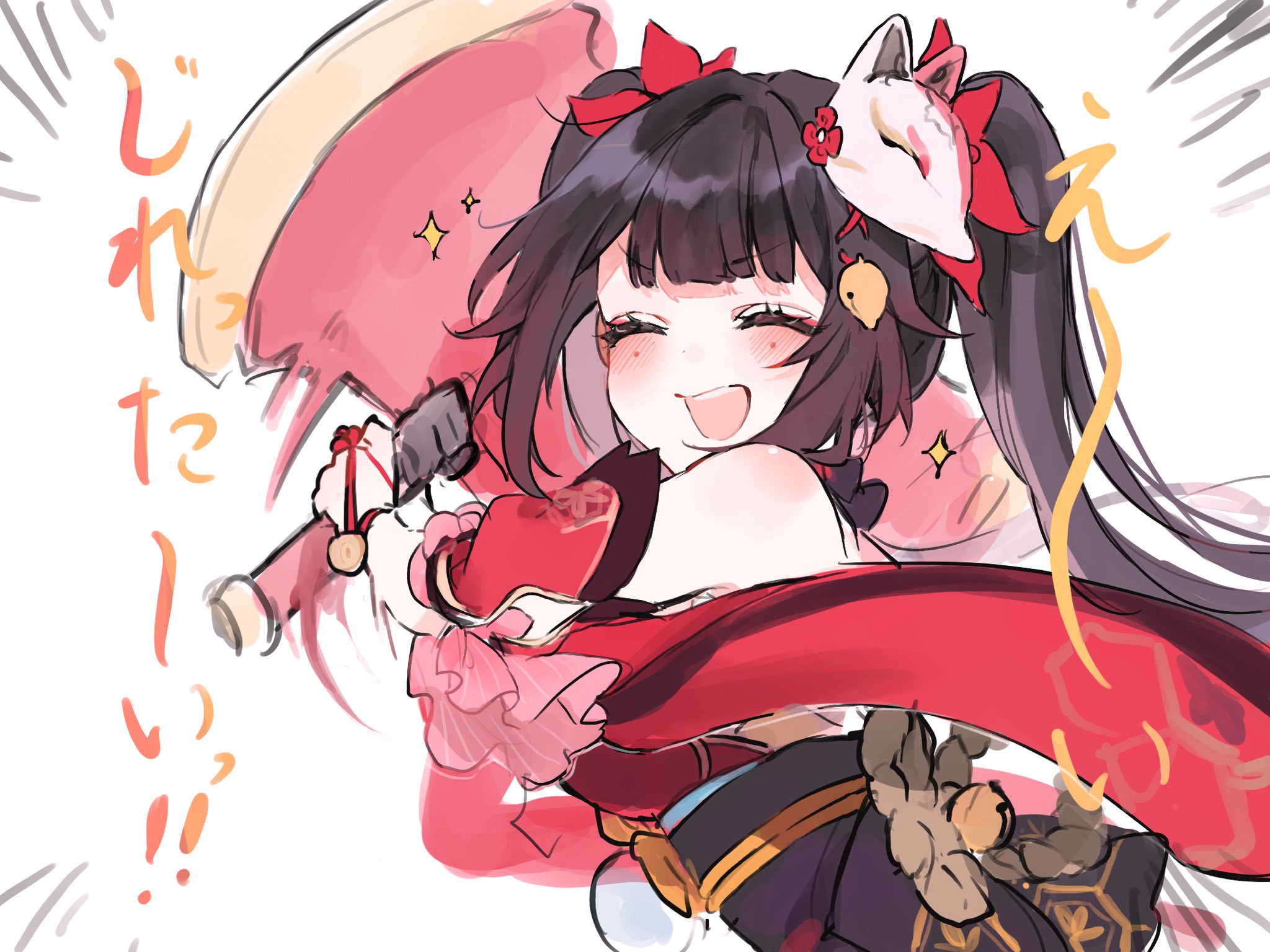 1girl bare_shoulders bell belt black_gloves black_hair black_sash blush closed_eyes detached_sleeves dress false_smile floral_print flower fox_mask gloves hair_bell hair_ornament hammer hands_up highres holding holding_hammer holding_weapon honkai:_star_rail honkai_(series) knot long_hair long_sleeves mask mask_on_head mole mole_under_each_eye mole_under_eye multiple_moles open_mouth orange_belt red_dress red_flower sash shinoo0915 sidelocks simple_background single_glove sleeveless sleeveless_dress smile solo sparkle sparkle_(honkai:_star_rail) standing teeth twintails v-shaped_eyebrows weapon white_background wide_sleeves x_hair_ornament