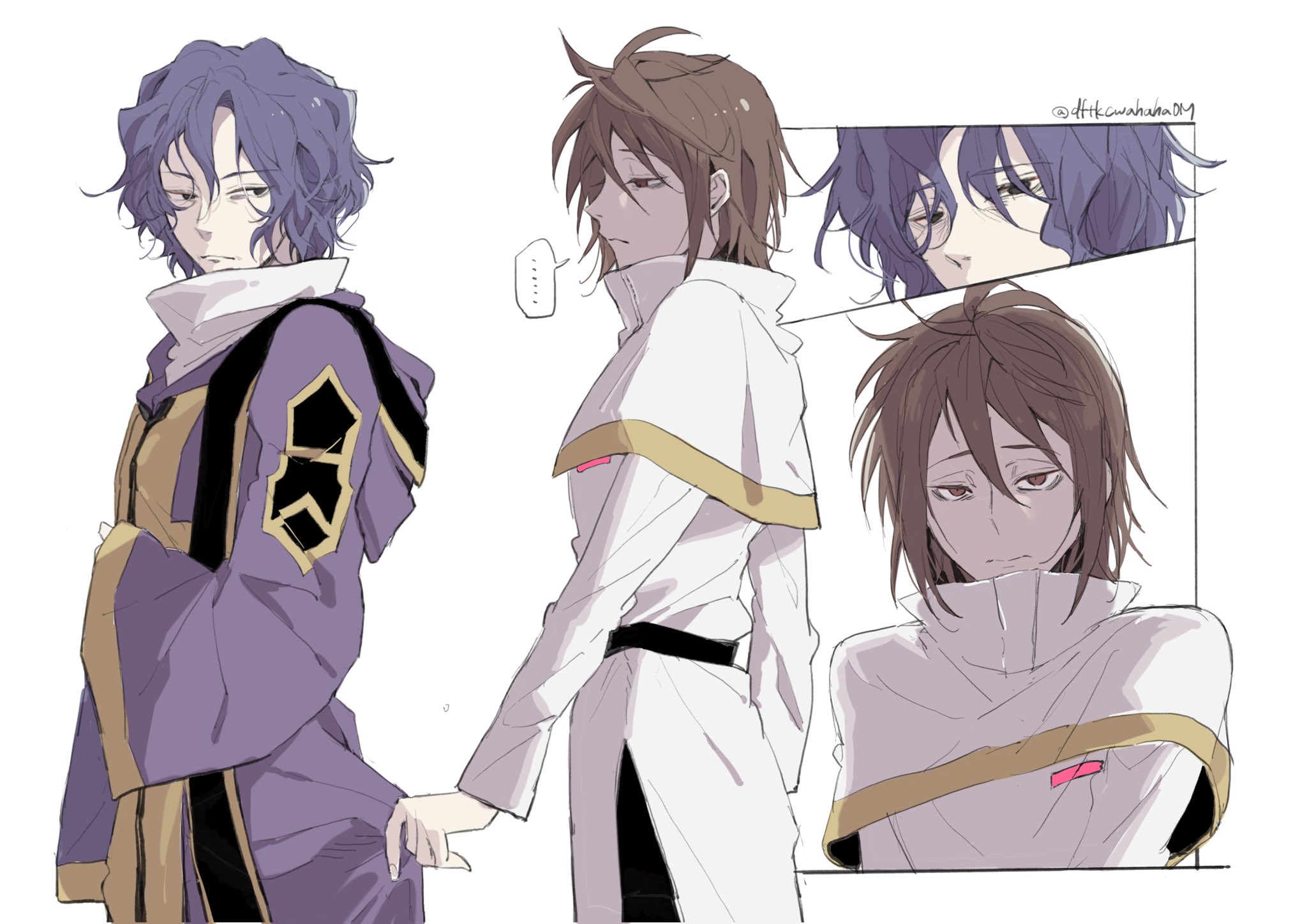 ... 2boys alternate_universe belt black_belt black_eyes blue_hair brown_eyes brown_hair capelet cheche chinese_commentary commentary_request gold_trim hair_between_eyes high_collar highres isoi_haruki long_sleeves male_focus multiple_boys purple_robe robe saibou_shinkyoku shirt short_hair simple_background spoken_ellipsis twitter_username utsugi_noriyuki white_background white_capelet white_shirt