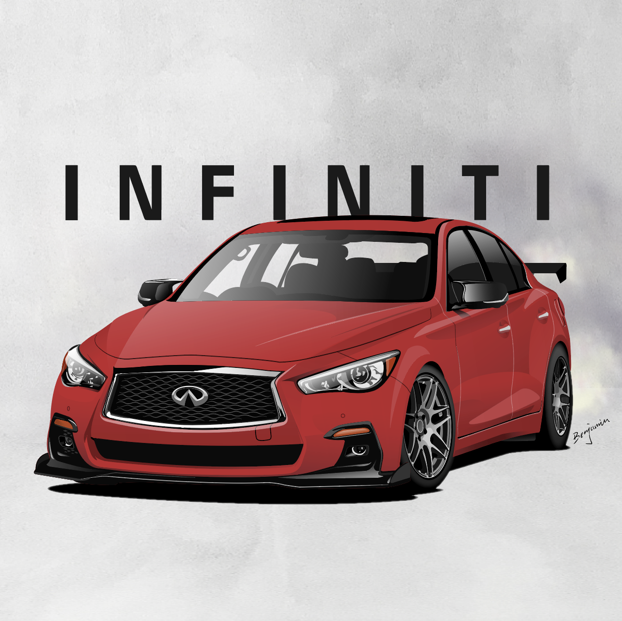 artist_name benjamin_(user_scjv3278) car highres infiniti_(company) infiniti_q50 motor_vehicle no_humans original red_car shadow smoke spoiler_(automobile) vehicle_focus