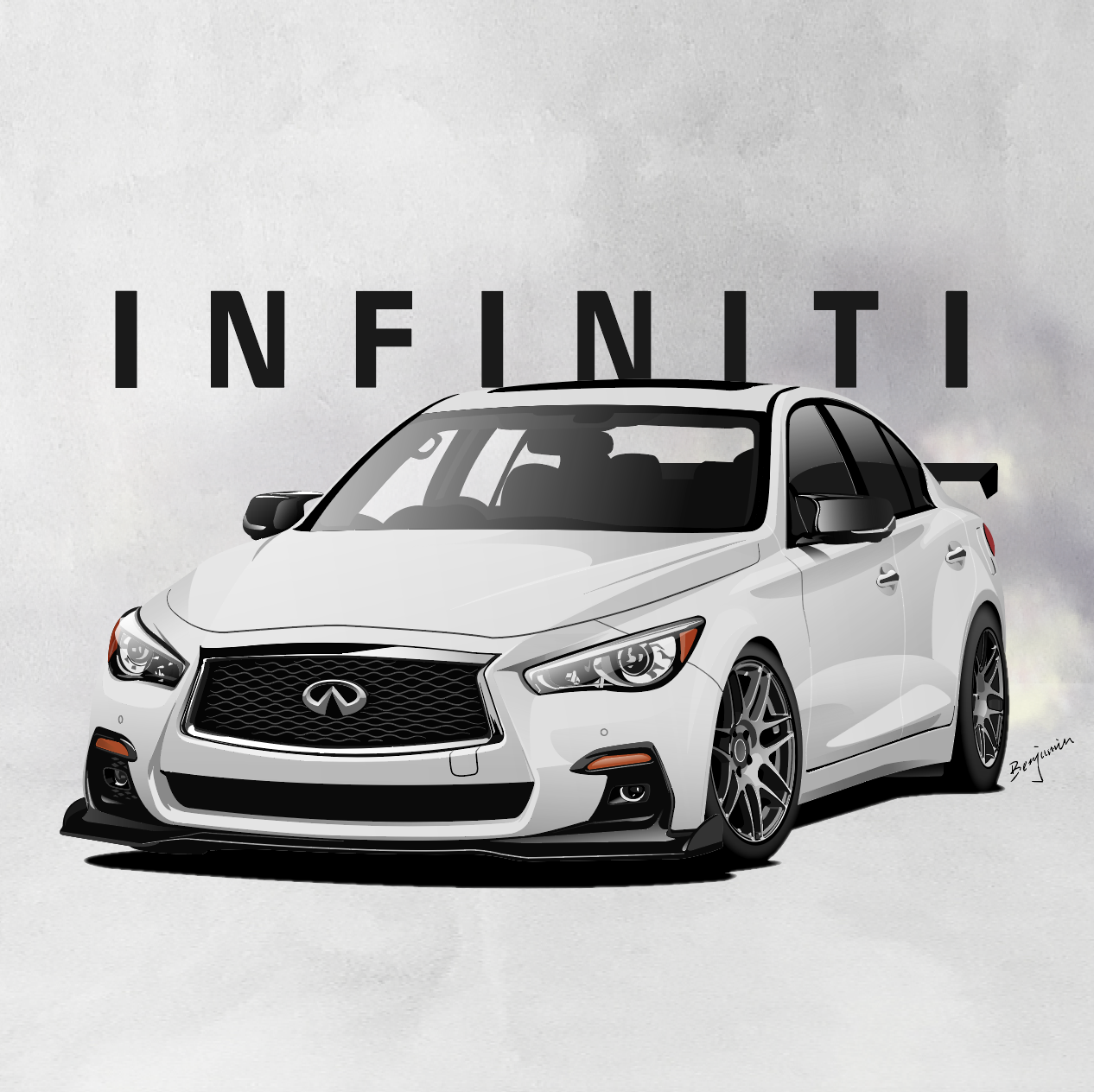 artist_name benjamin_(user_scjv3278) car highres infiniti_(company) infiniti_q50 motor_vehicle no_humans original shadow smoke spoiler_(automobile) vehicle_focus white_car