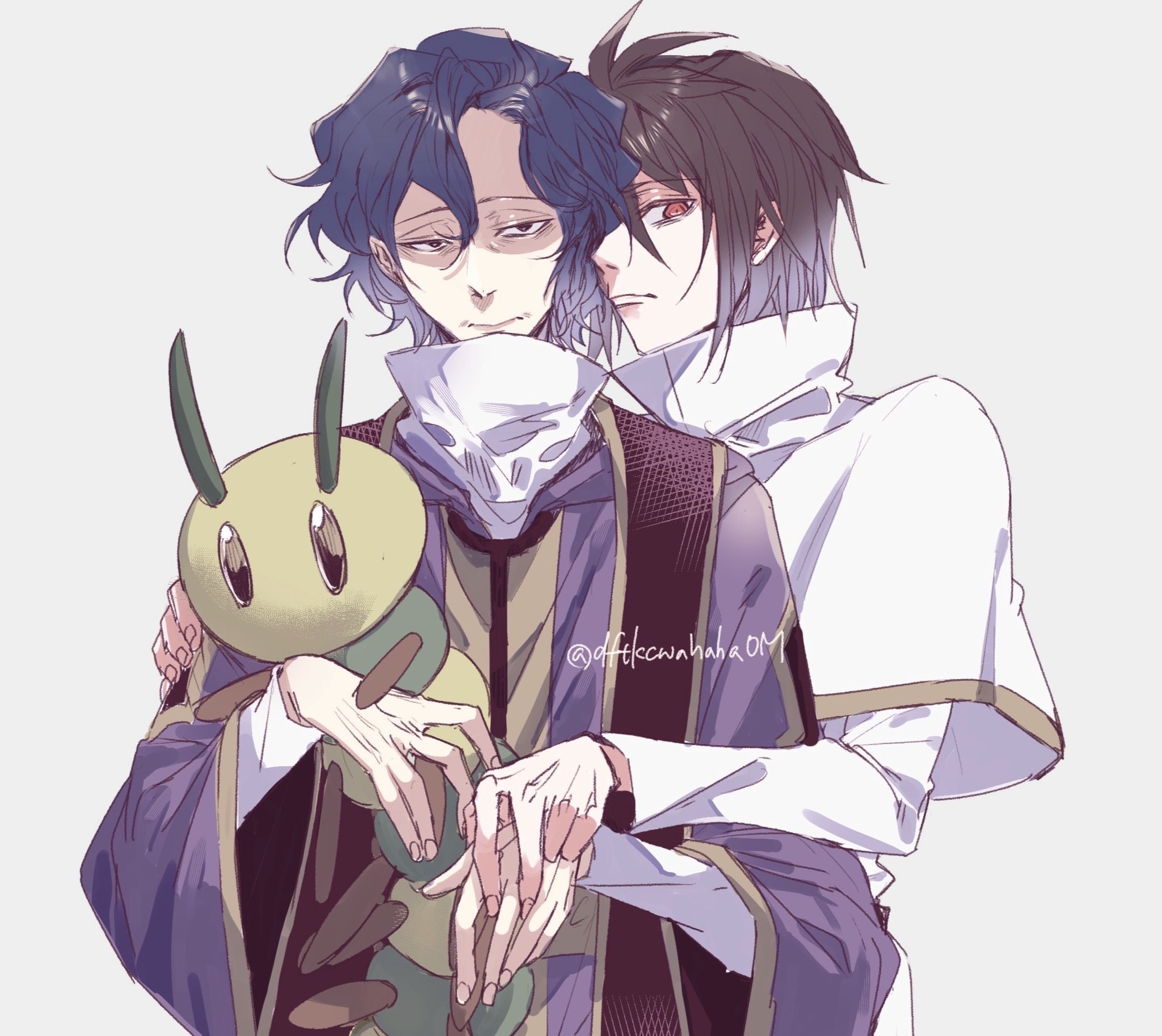 2boys alternate_universe black_eyes blue_hair brown_hair capelet cheche chinese_commentary closed_mouth commentary_request gold_trim grey_background hand_on_another's_arm high_collar highres holding holding_hands holding_stuffed_toy hood hood_down isoi_haruki male_focus mature_male multiple_boys red_eyes saibou_shinkyoku shirt short_hair stole stuffed_animal stuffed_toy twitter_username upper_body utsugi_noriyuki white_capelet white_shirt